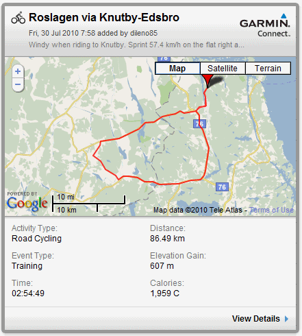 Turen blev pga min felcykling något längre än vad jag tänkte, 87 km, men vad gör det? Det var skön träning. Vid flera tillfällen på vägen hem spurtade jag på friskt på några raksträckor och kom som mest upp i 57,4 km/h – på en platt raksträcka (med medvind). Jag vågade inte ta i allt jag kunde då jag kände hur framför allt bakdäcket började vobbla något, på grund av det lite för dåliga lufttrycket.