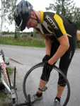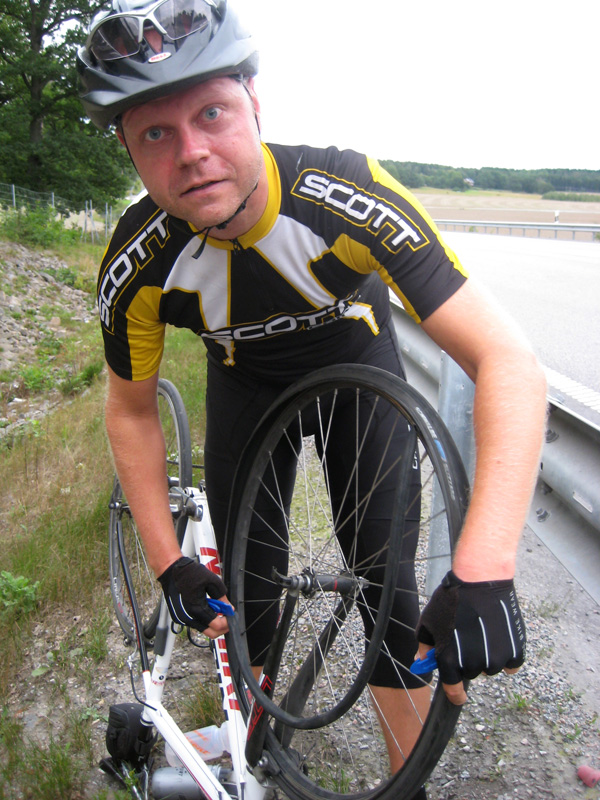 Stockholmsvägen från Vaxholm gick snabbt, riktigt snabbt. Jag drog och det gick hur bra som helst – med en stabil snitthastighet på ca 34 km/h. Här fick vi dagens första otur – första punkteringen på Peters framdäck! Efter några om och men var det fixat, och vi fortsatte mot Arninge. Väl där cyklade vi fel och hamnade på en dålig väg – och det blev punktering på Peters framdäck igen! Typiskt, men nu hade vi redan fått in skickligheten på att byta slang, och denna gång höll det ända hem.