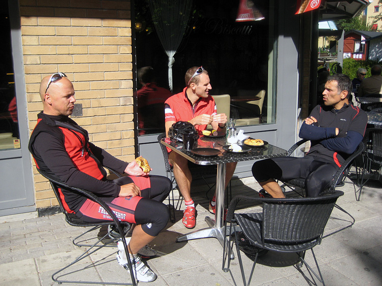 Väl i Vallentuna styrde vi mot centrum och Café Biscotti. Där blev det kaffe, juice och helt enkelt energipåfyllning. Här fick vi bla reda på att ena Peter E egentligen var hockeyspelare. Skönt att han även hittat cyklingen nu! 😉