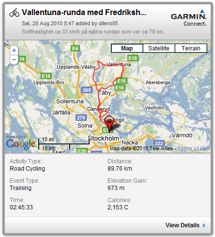 4. @Per: Min Garmin räknar i detta fall maxpuls per runda. Under ovanstående runda uppnådde jag en högsta puls på 188 och snittade på 167 – dvs 90 % av max. Men jag ska undersöka hur jag kan få fram min maxpuls generellt sett vad gäller cykling! 🙂