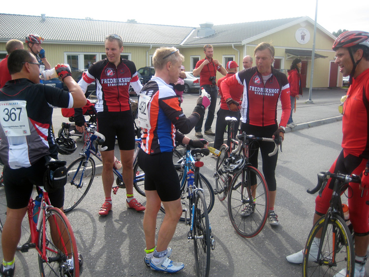 Undertecknad fick med exakt 2 mil kvar dessutom kramp i såväl insida lår som i båda vader – mitt i en nerförsbacke när jag var uppe och drog. Det var bara att gå ner på 25 km/h, trycka i sig en GT-tablett och skölja ner med sportdryck – och sen rulla upp i lite högre hastighet igen. Övriga tappra 5 Fredrikshofare såg bra ut när de drog på i 37 km/h mot mål!