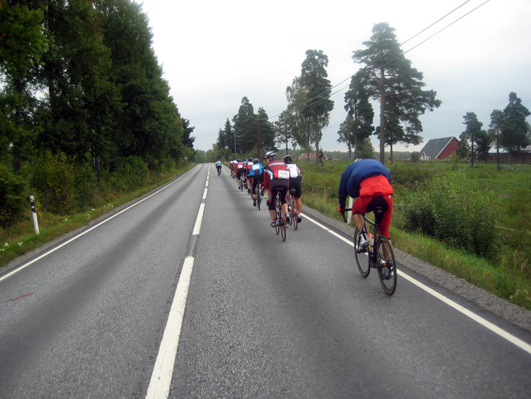 Efter depån blev det lite mer backigt än tidigare, smala vägar och så framför allt vinden som fiende, så snittet gick ner till 32,8 km/h kommande 5 milen. Vår grupp på från början 14 cyklister hade under loppet också hunnit med att stundtals bli 30-40 man stor, för att vid ca 10 mil bli allt färre och färre, tills vi till slut var 6 man kvar från Lidingögruppen, då med drygt 2 mil kvar att cykla. Synd att vi splittrades, men det gick helt enkelt för snabbt och ibland ryckigt och plötsligt när man ropade och kollade bak fanns ingen där.
