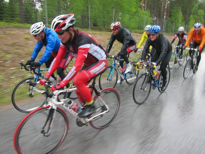 Det är extremt viktigt sådana här dagar att hålla avståndet och vara noga med det. Om man på torrt väglag håller 30-40 cm till framförvarande cyklist så bör man ha minst 1,5 m när det är blött. Jag hörde om en snabbklunga på Roslagsvåren där de höll 4-5 meter, vilket såklart blir betydligt jobbigare per cyklist men även säkrare. Även detta med glasögon som immar igen eller får vatten på sig – ett bra komplement är i så fall att använda keps – då blir det inte lika jobbigt.