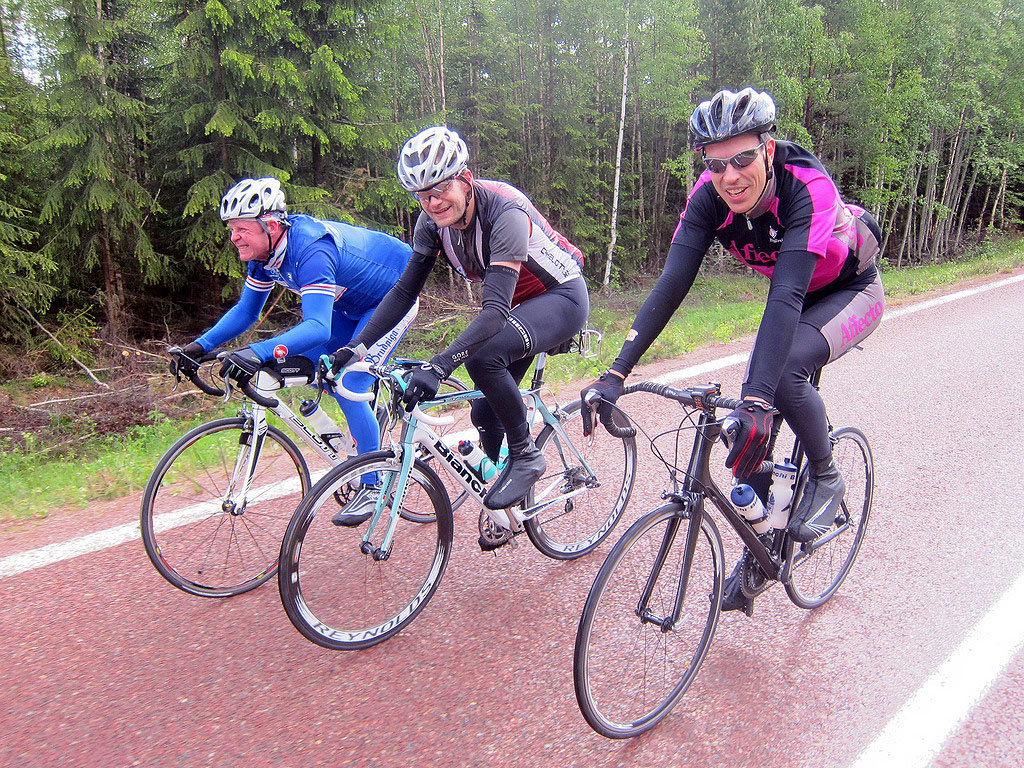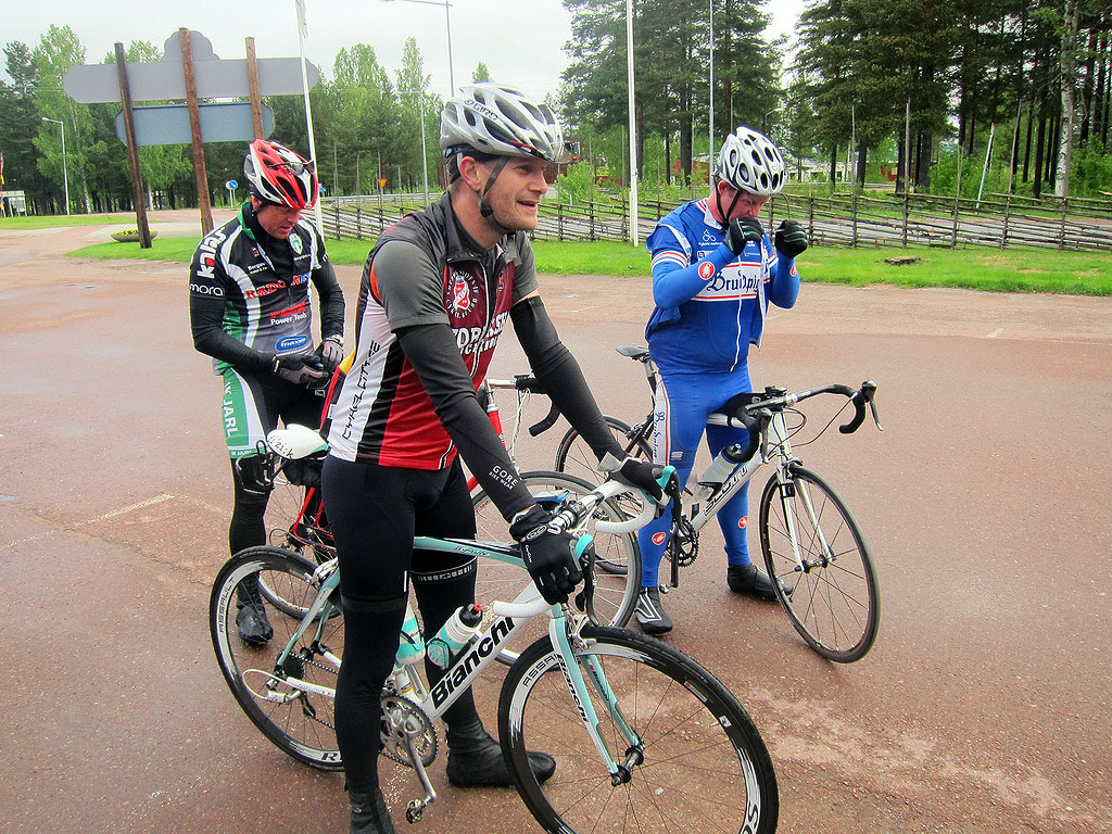 Tyvärr så bestämde sig Martins sadel för att strejka efter några mil och han var tvungen att cykla hem till Rättvik ståendes.. Aj. Vi andra dundrade på i tvåpar och det gick snabbt. Lite kul att ligga på 10 slag under tröskeln när man var uppe och drog, och sedan ligga på ”rulla lugnt”-puls när man låg bakom, hehe. Jag kan lugnt säga att jag inte är den bästa i kantvind eller motvind 😉