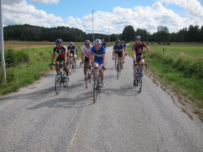 Efter ungefär 6 mil och 8 backar blev det fika hemma hos Henrik, riktigt grymt med chokladbollar, kaffe, cola och solen lyste. Sedan var det bara 4 mil och 5 backar kvar! Tyvärr så fick vi andra punkteringen i gruppen igen innan vi kunde fortsätta tävlingen, tiden rann iväg och halva gruppen valde att åka hem mot Södertälje istället för att fullfölja. Jag fick trots stor tävlingslust och troligtvis en andraplats att försvara också vika ner mig för trycket 😦