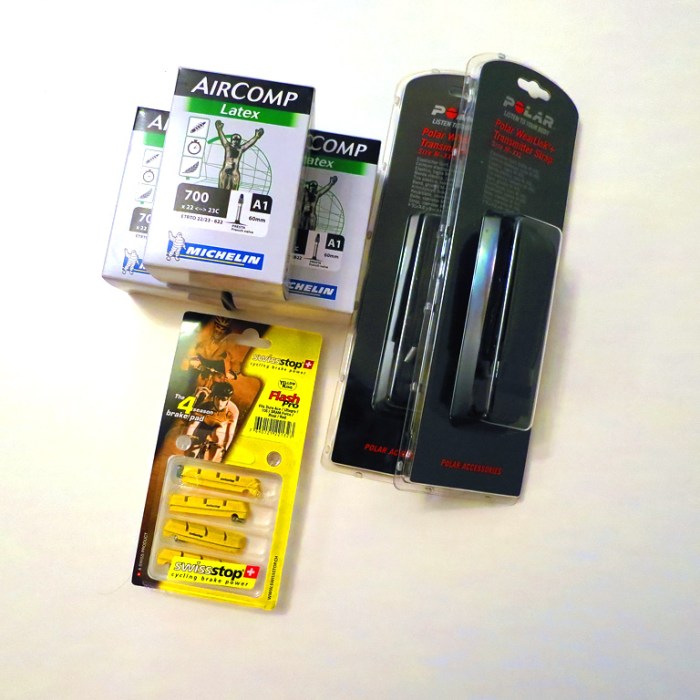 Nya Michelin latexslangar och klassiska Swissstopp-gummin för kolfiberfälg kommer att göra sig bra tillsammans med mitt sprillans GoVest Tyr C38-set. Polar pulsband behövdes på nytt då de gamla pulsbanden gått ut i strejk.