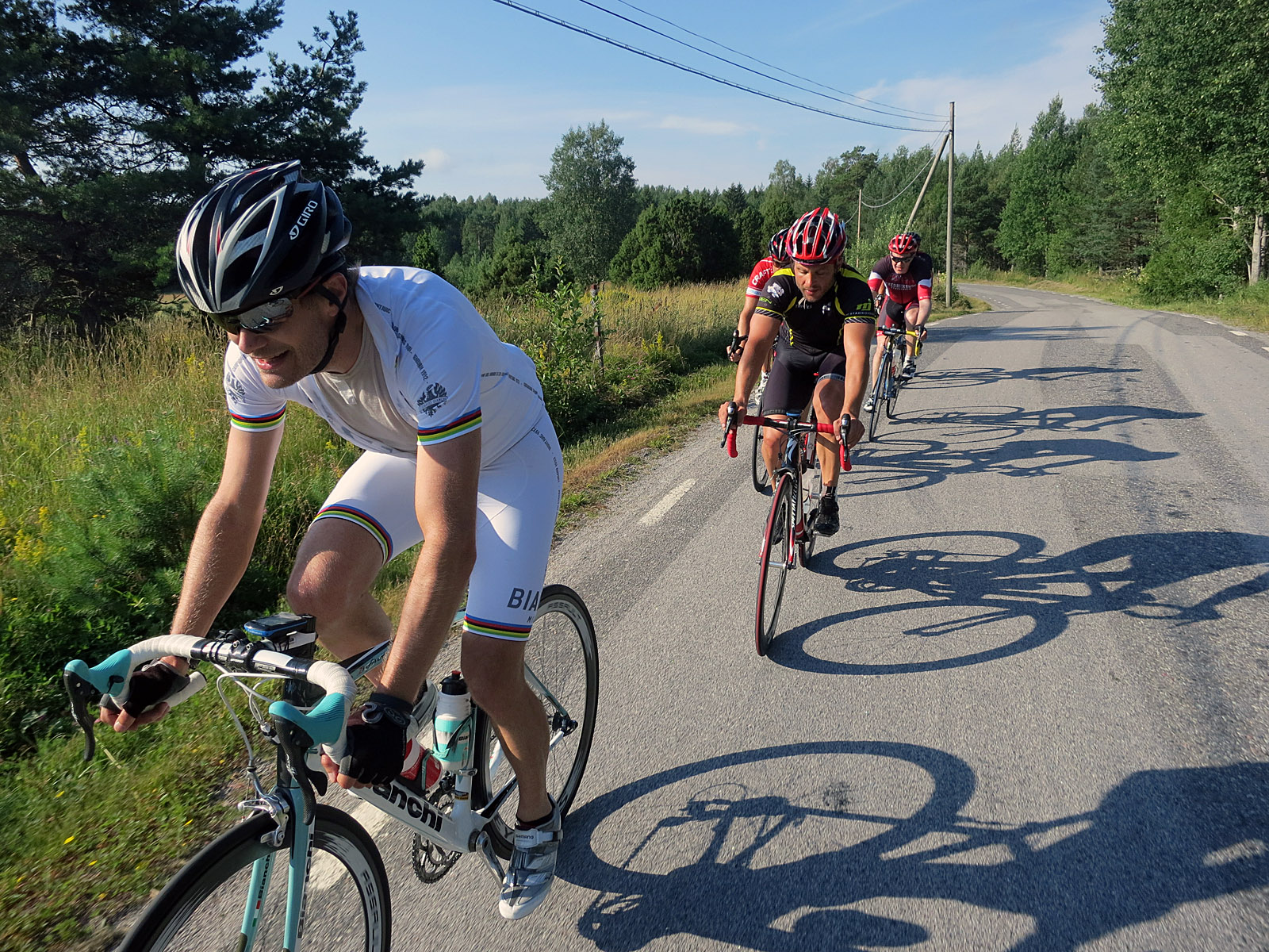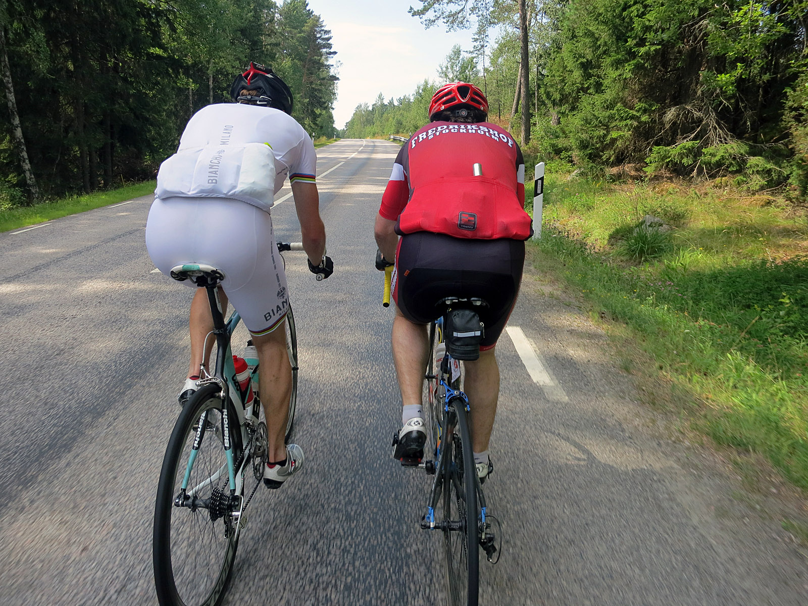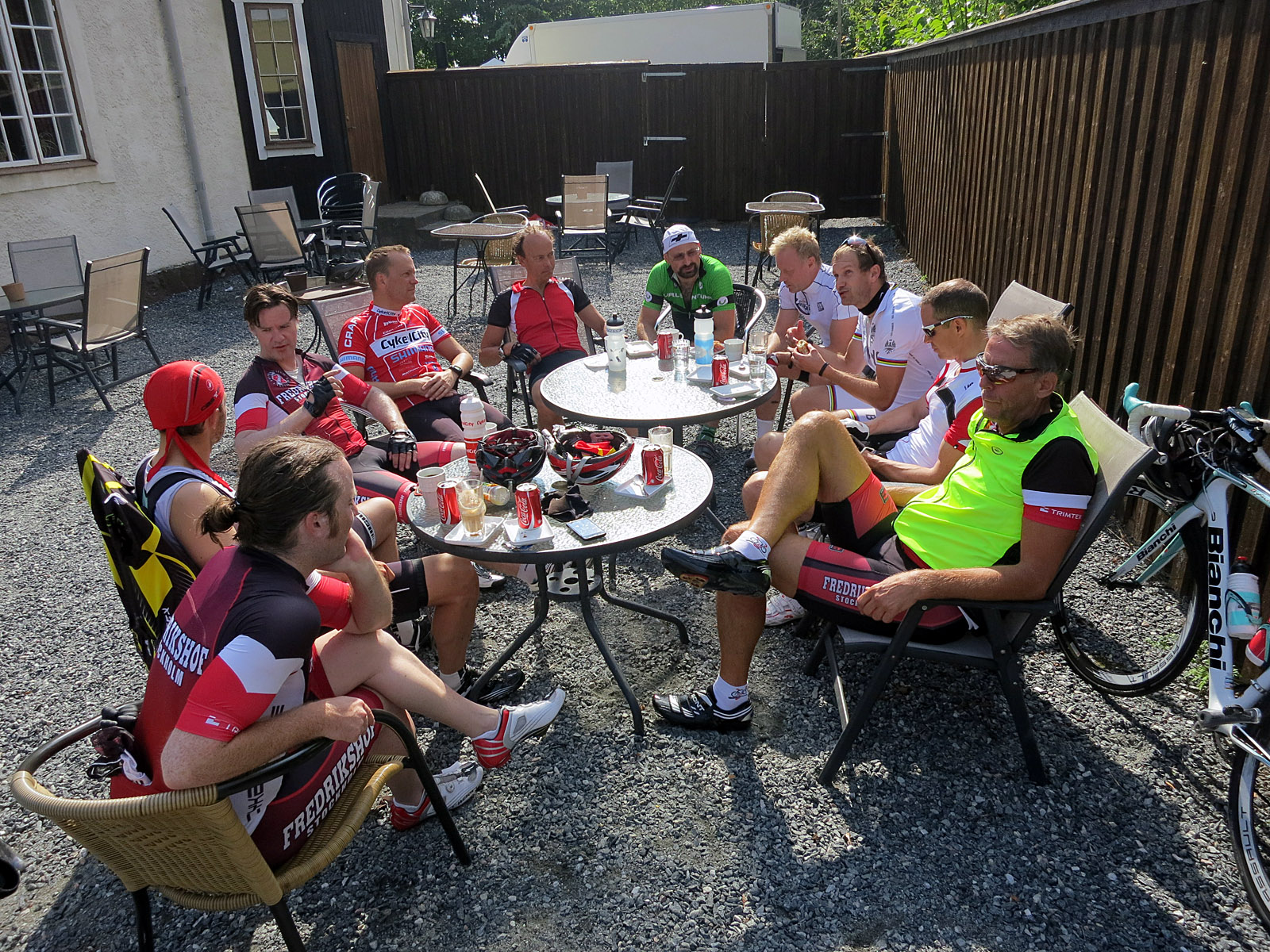 Fika blev det hur som helst i Rimbo, efter 8 mil och 34 i snitt i något som var motvind och kantvind mest hela tiden? Här hade Lasse också väntat på oss och valt de bästa platserna på uteserveringen. Riktigt skönt att sitta och steka i solen, fast jag personligen egentligen inte gillar fika mitt i ett pass. Dock socialt och det älskar vi när det gått en hel sommar sedan man såg de flesta bekanta ansikten! Jag tryckte i mig en bar, 1 toscakaka och 1 burk Cola innan vi tog sikte på snabbaste vägen hem via Roslagsstoppet. Lasse och Andreas däremot tog sikte på Norrtälje och Gräddö-hållet istället. Ryktet säger att de fick en solig och fin tur tillbaka 🙂