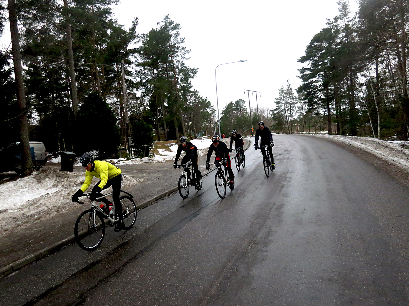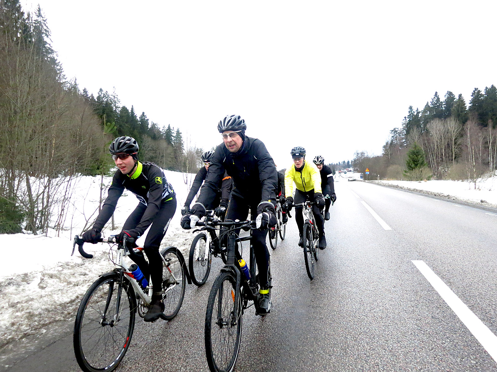 När vi passerat Södertälje började några av oss bli lite trötta och då dök alltså självaste Peter E upp för att göra livet gladare i gruppen 😉 Efter att ha legat framme och dragit rätt långa bitar började jag bli lite krispig och backen upp mot Hall fick jag bita i något. Men det var fler som var mer krispiga och jag drar gärna lite extra på träningar för att få ut så mycket träningseffekt som möjligt, så det fortsatte lite så. Jag hade bara ett dubbdäck på medan åtminstone Mic och Peter H hade två (det var därför jag och inte de vurpade förra helgen på Järva antar jag, hehe).