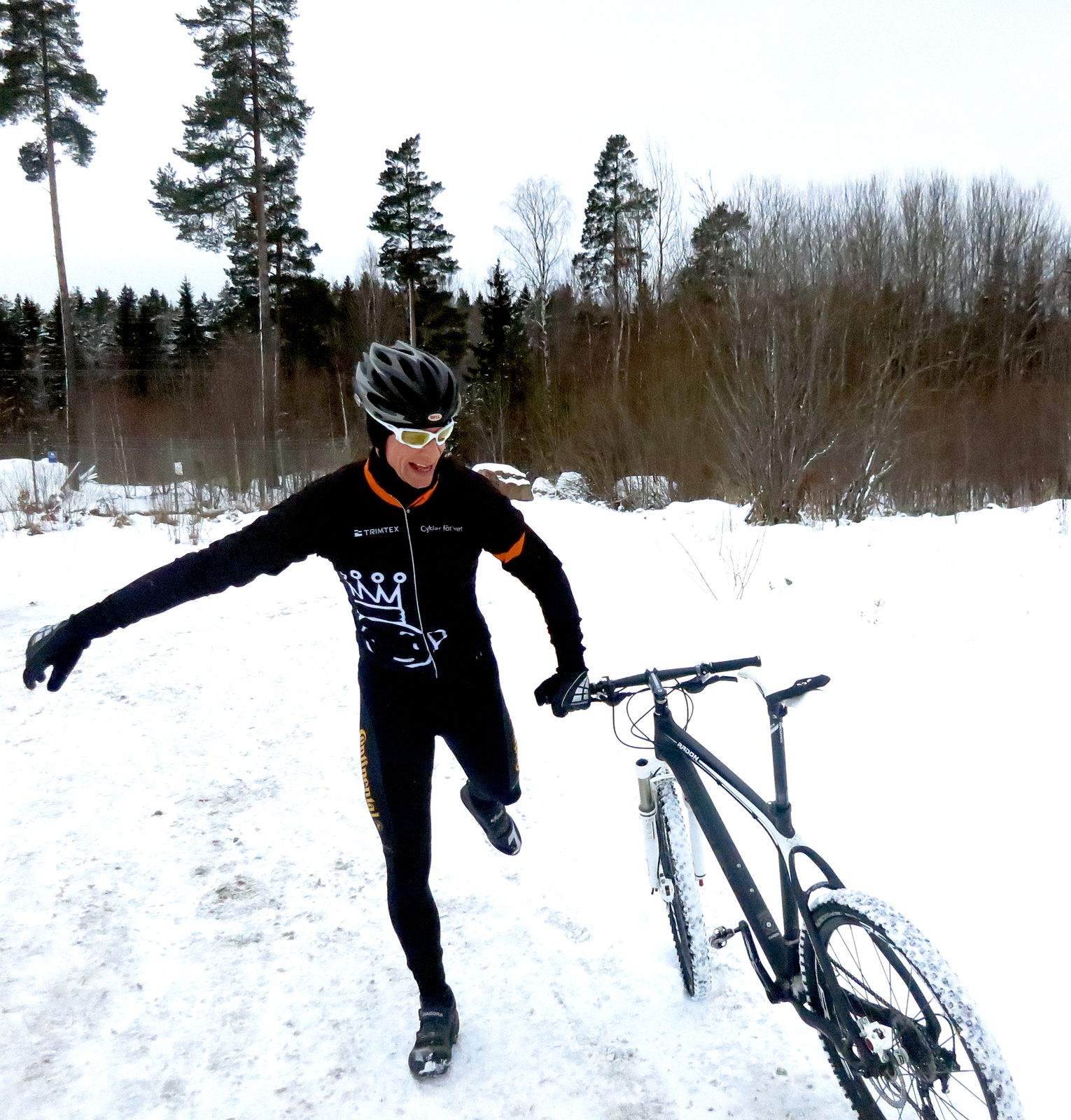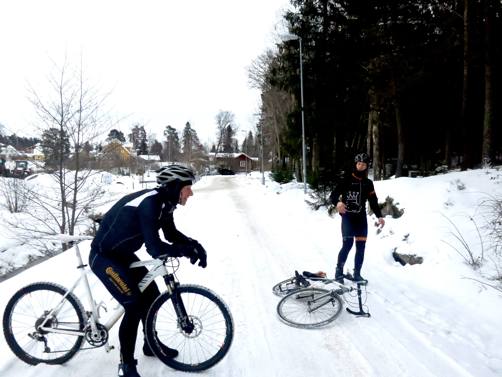 Vilse var vi också under passet, vid ett tillfälle. Vi hade lämnat fältet bakom oss, cyklade runt nordost om Järva för att leta efter en väg in som jag kände till. Vi hittade vägen in, bara det att den blev smalare och smalare och ledde till allmän misär, vurpor och till slut springa med cykeln för att ta sig fram. I 10 cm djup snö, med några små vattenhål för att göra det hela lite mer cyclocross-aktigt 😉 När vi var klara var vi tillbaka på vägen där vi hade börjat, fast 50 meter längre bort. 😉 Därefter hittade vi tack och lov enkelt tillbaka in på fältet och kunde snurra tryggt åt Bögs gård-hållet och sedan in till stan.