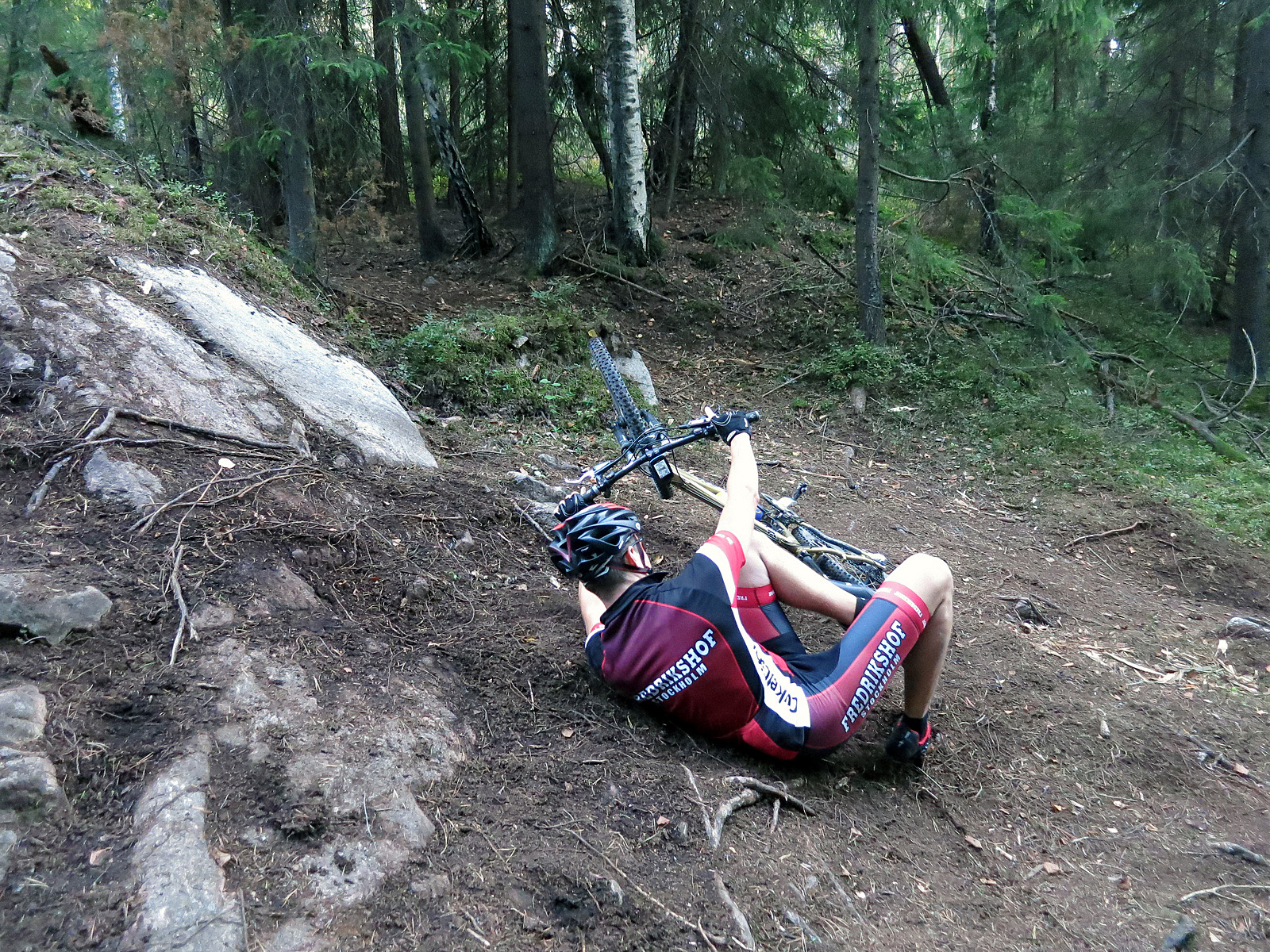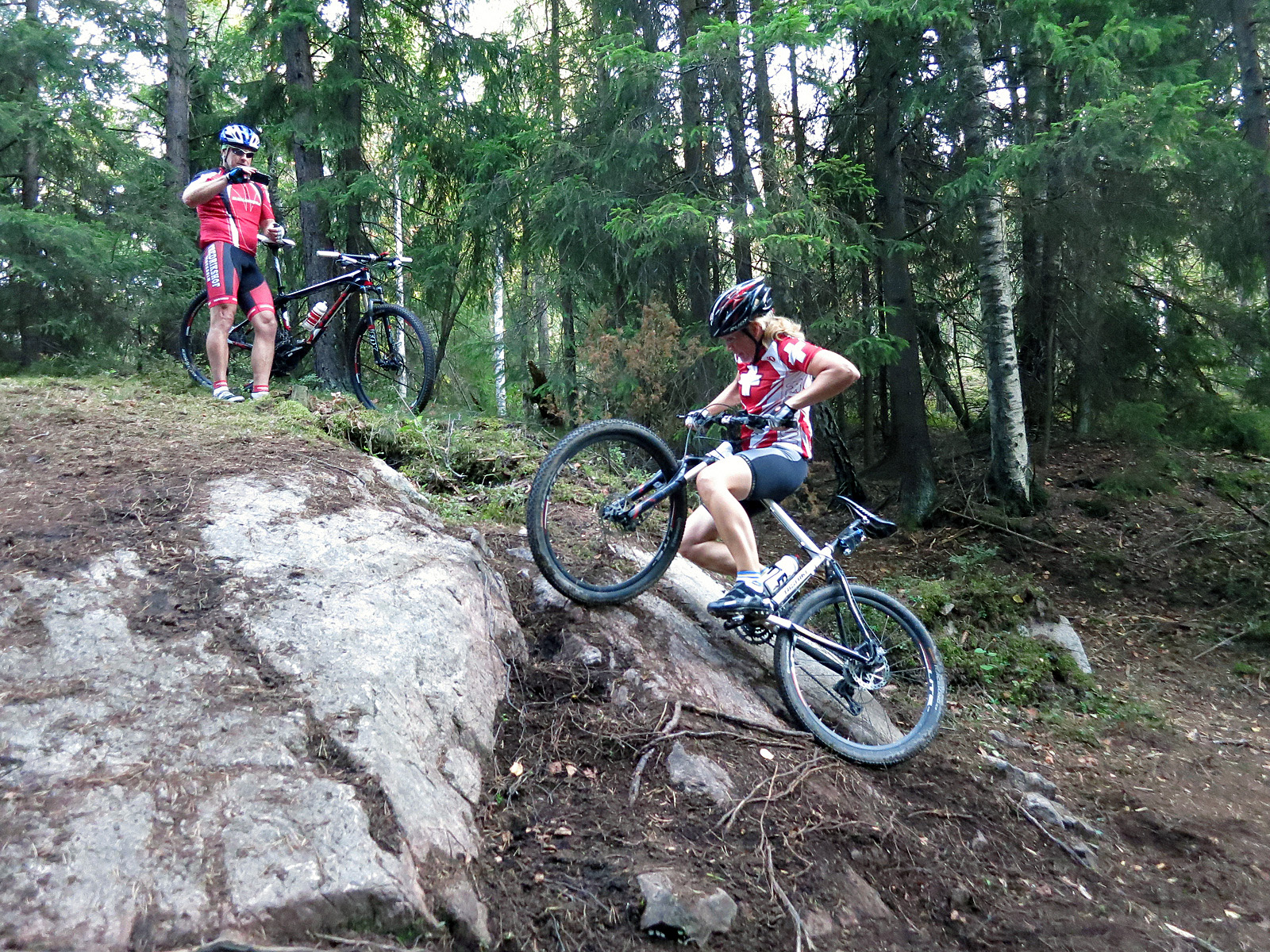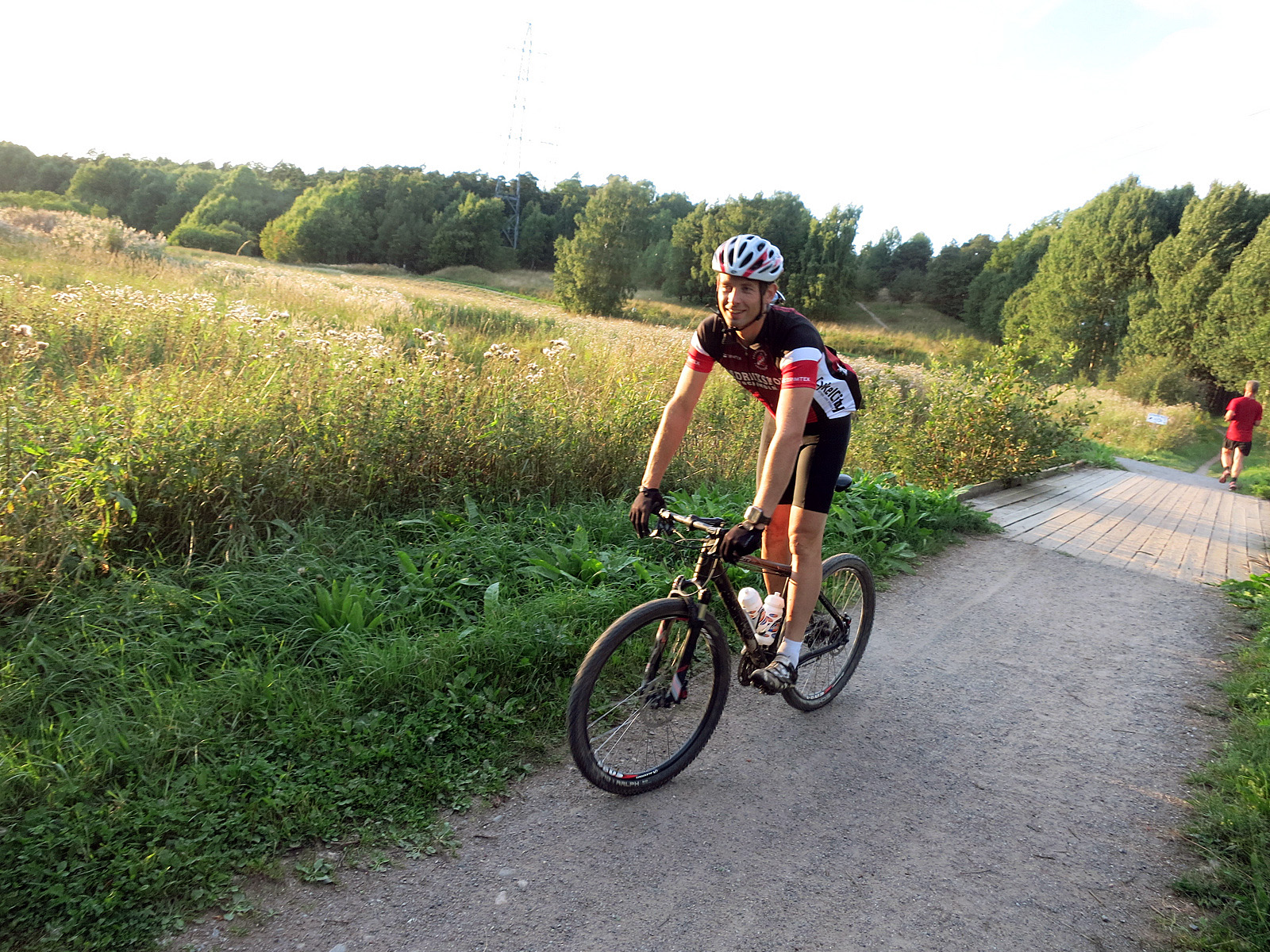 Ledda av Edvard, fd Hofvare och numera elitcyklist i Valhall, tog vi oss runt över stock och sten på Nick-spåret. Och det var ju sjukt kul! Tekniken sitter verkligen inte och med lånad MTB vågar i alla fall jag inte chansa här och var. Det fanns några roliga tekniska partier, bl a en liten bergskam att ta sig uppför, en ”dubbel-drop” och så min favorit: långa, lite brantare backar i skogen.