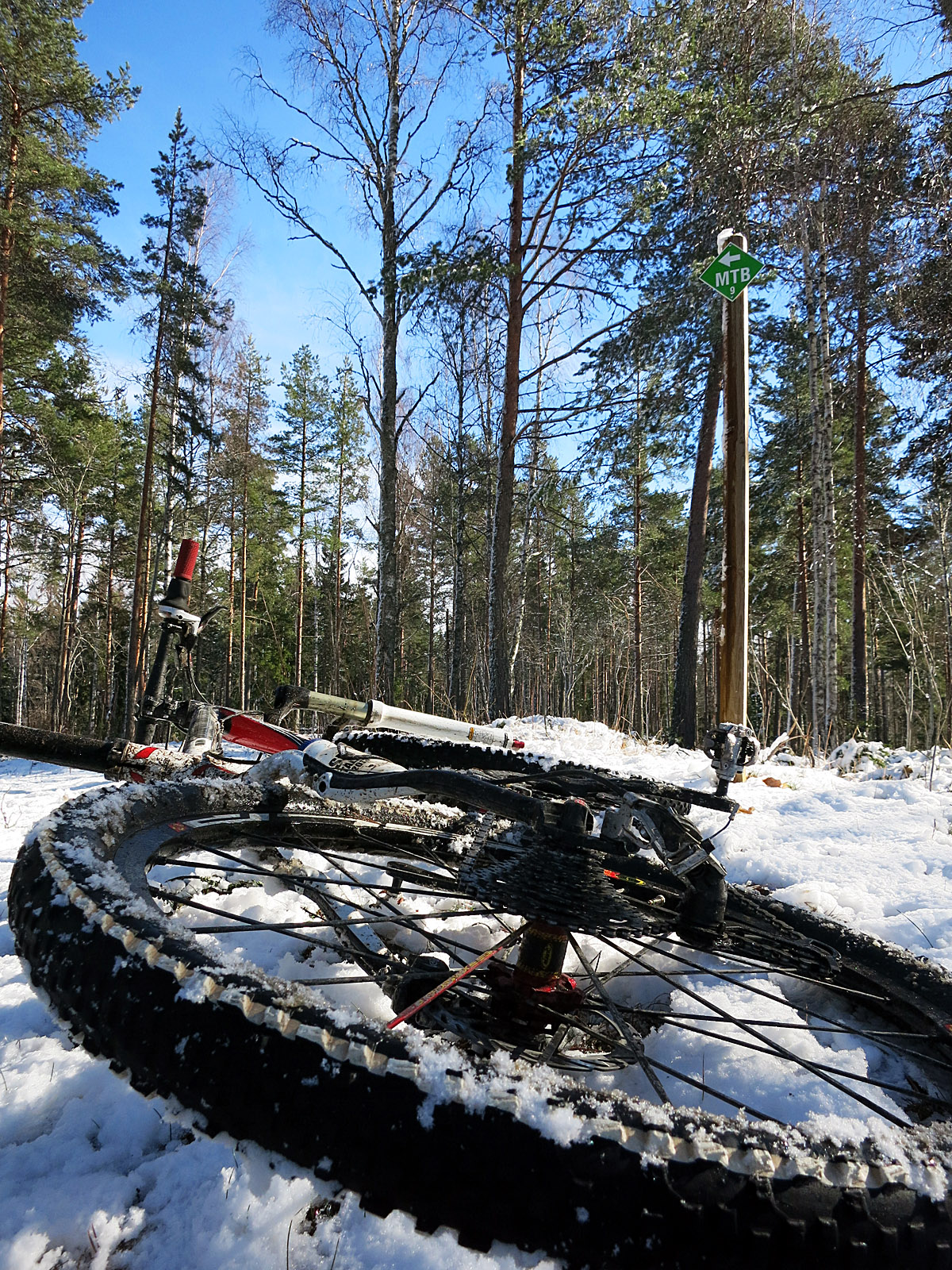 I Högbo finns det 3 st ”MTB-leder” – blå på 10 km, grön på 9 km och lila på 15 km. Den gröna är dock överlägset mest stig så valet var lätt. De inledande kilometrarna gjorde ingen glad, några cm nysnö på grusväg.. men sedan blev det bättre när gröna leden böljade upp och ner på riktiga stigar 🙂