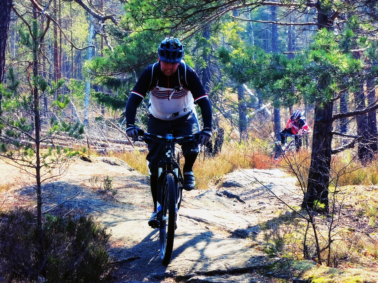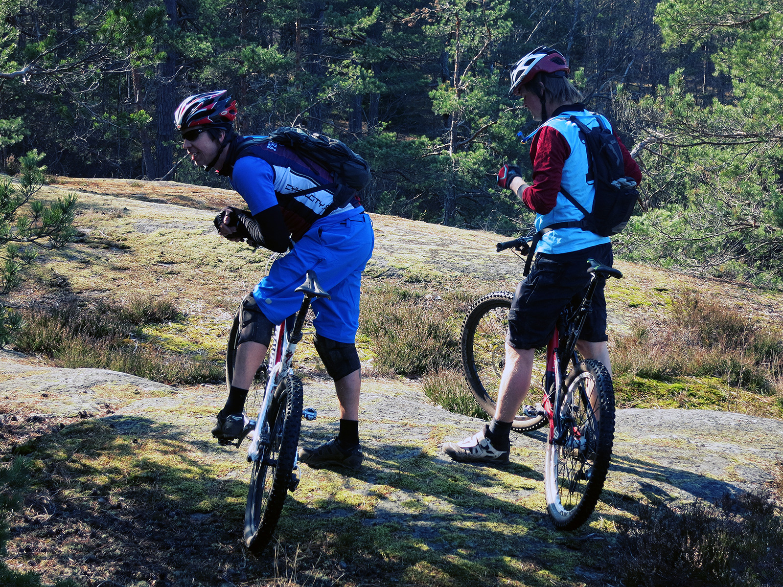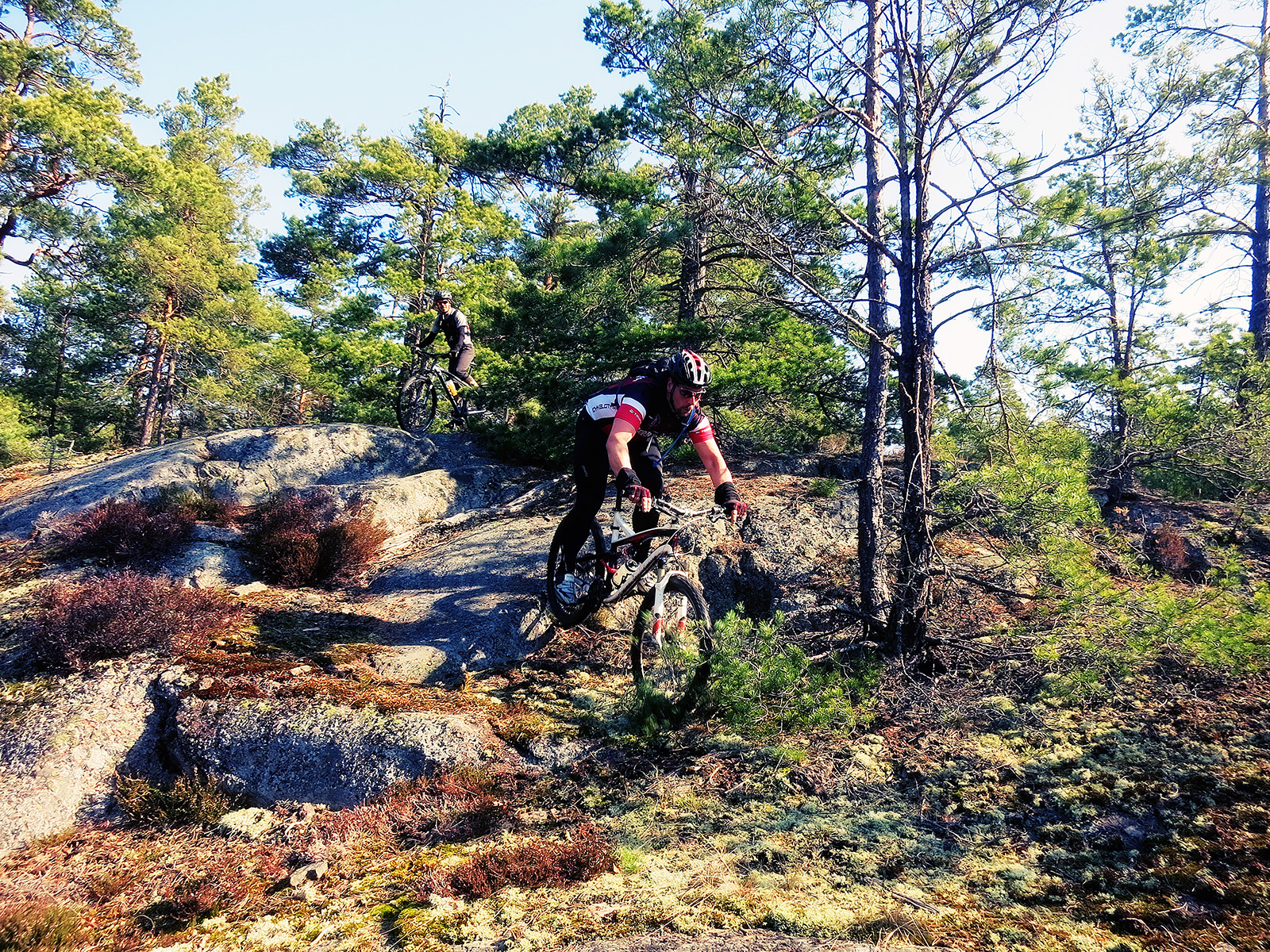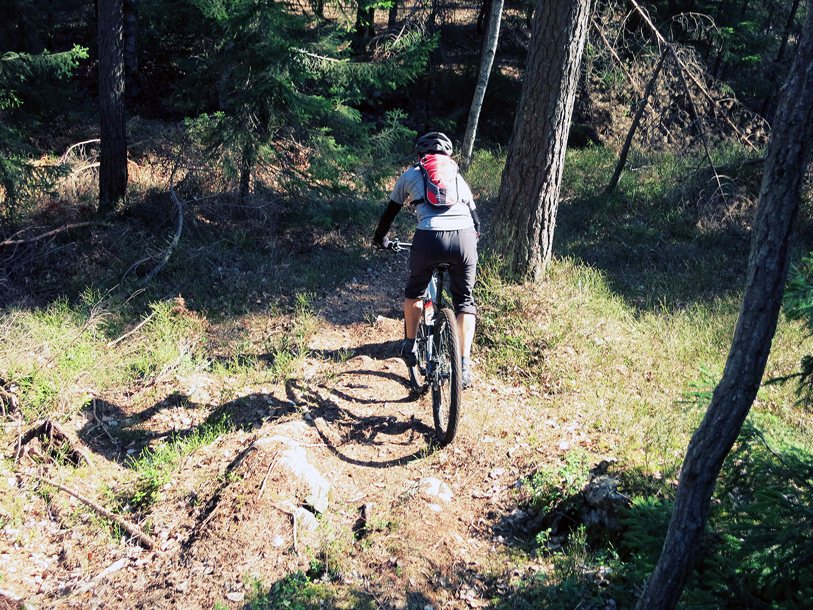 Vägen var i det närmsta bilfri till Orminge centrum där vi skulle starta. Vi var fem lyckliga som hängde på efter Jonas in i skogen. Och vilken skog sedan! En kombination av singletrack, knepiga bergshällar, ovärdiga stigar, rötter och så inte minst omöjliga uppförskörningar 😉