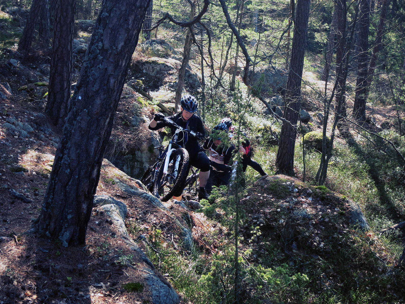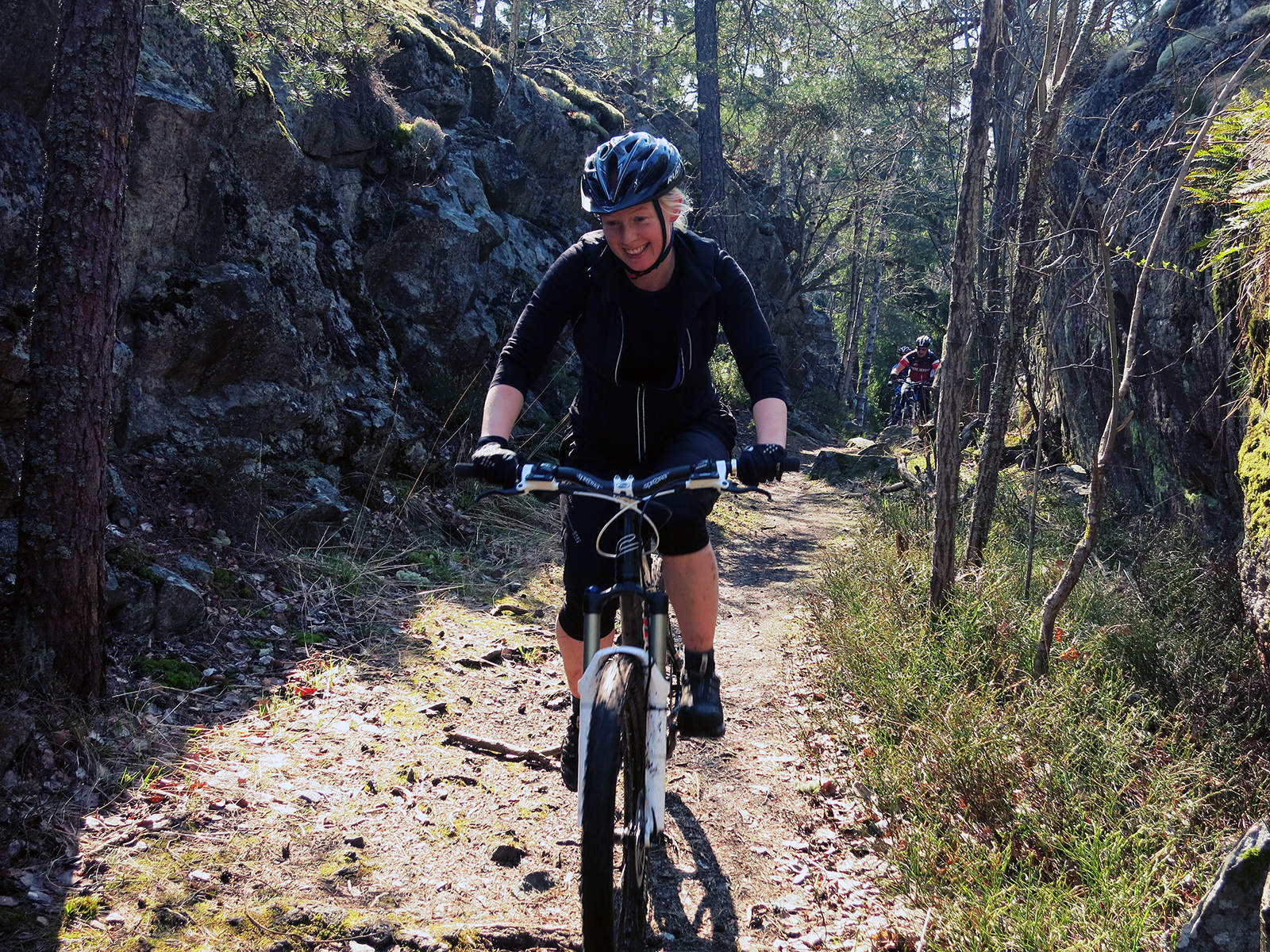 Jag och en till på hardtail fick vara extra noggranna med åkningen. Trots det lyckades jag med att repa min fina ram lite. Mitt i skogen fick vi sällskap av en tjej som bara hängde på. Skön stil!