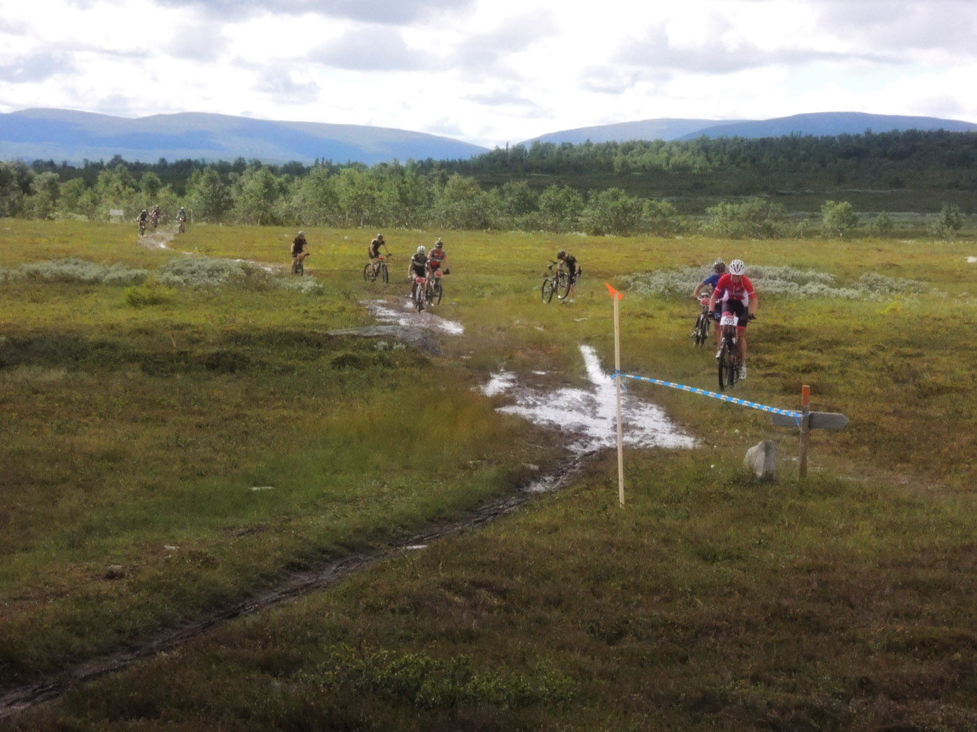 In på första stigpartiet och täten sticker direkt. Jag kan inte göra något alls än att mata på i min takt med rejält hög puls. 5-6 st bakom mig och jag ligger nog topp 10 i loppet totalt. En liten stund senare kommer dagens första rejäla stigning upp till trädgränsen nedanför Skarvarna. Jobbig stigning stundtals men riktigt kul på en bit singletrack. Nämnde jag att denna stigning går över flera bäckar? I år är banan extremt blöt eftersom det regnat en del veckan innan loppet och det ger en dimension till i loppet – bäckarna forsar nämligen fram på flera ställen och det är rätt blött på många ställen.