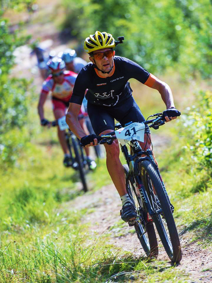 Jag ligger på rulle sist i min grupp över suverän singletrack med fina kurvor och i slutet bränner gruppen ifrån mig och jag blir ensam. Bara att nöta på med ca 20 km kvar, första gången i loppet som jag nu är ensam och bakom mig ser jag ingen heller. På ett snabbare grusvägsparti blir jag ikappåkt och efter en taskig kurvtagning av mig även ifrånåkt lekande lätt.. jag är trött, men i backarna är jag i alla fall inte tröttast och mot förmodan går jag ikapp och om några i sista backen. Återigen ligger jag nu ensam och smiskar grus och stig, kilometrarna tickar ner och jag känner att krampen börjar smyga sig på. Försöker värja den och det går. Dricker mycket.