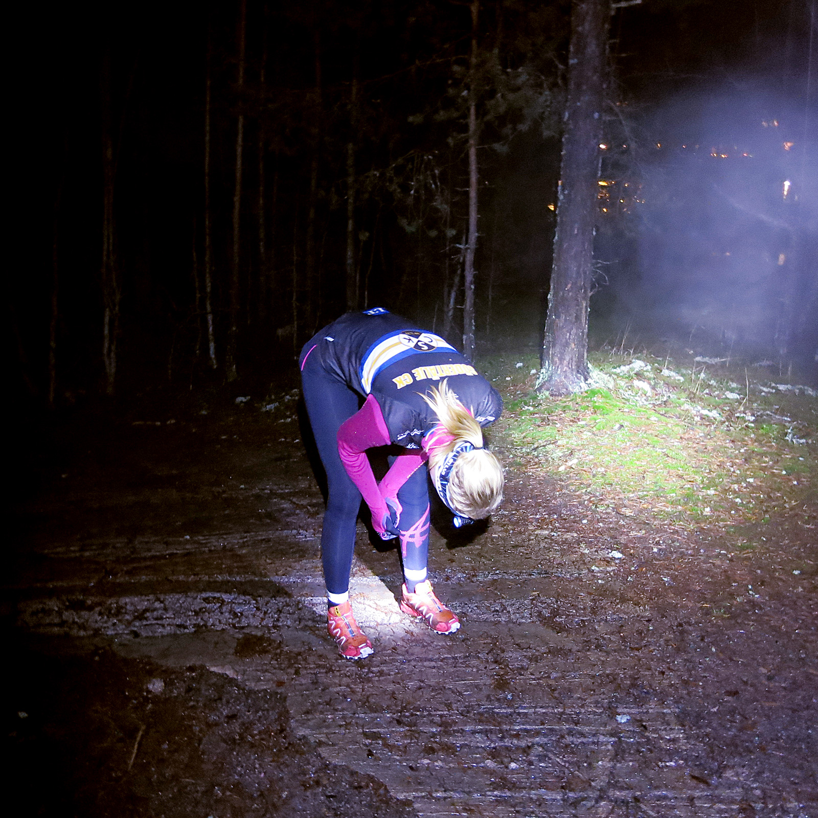 För några veckor sedan scoutade vi nya stigar på andra sidan motionsspåret i början på vårt klassiska Grönsta-spår. Det är lätt att hitta i dagsljus, aningen svårare i mörker, trots starka lampor. Så vi sprang vilse, hamnade i några mindre träsk och irrade runt som orienterare i ingenmansland, innan vi landade på asfalten i Trolldalen och kunde kötta vidare på de fina skogsstigarna.
