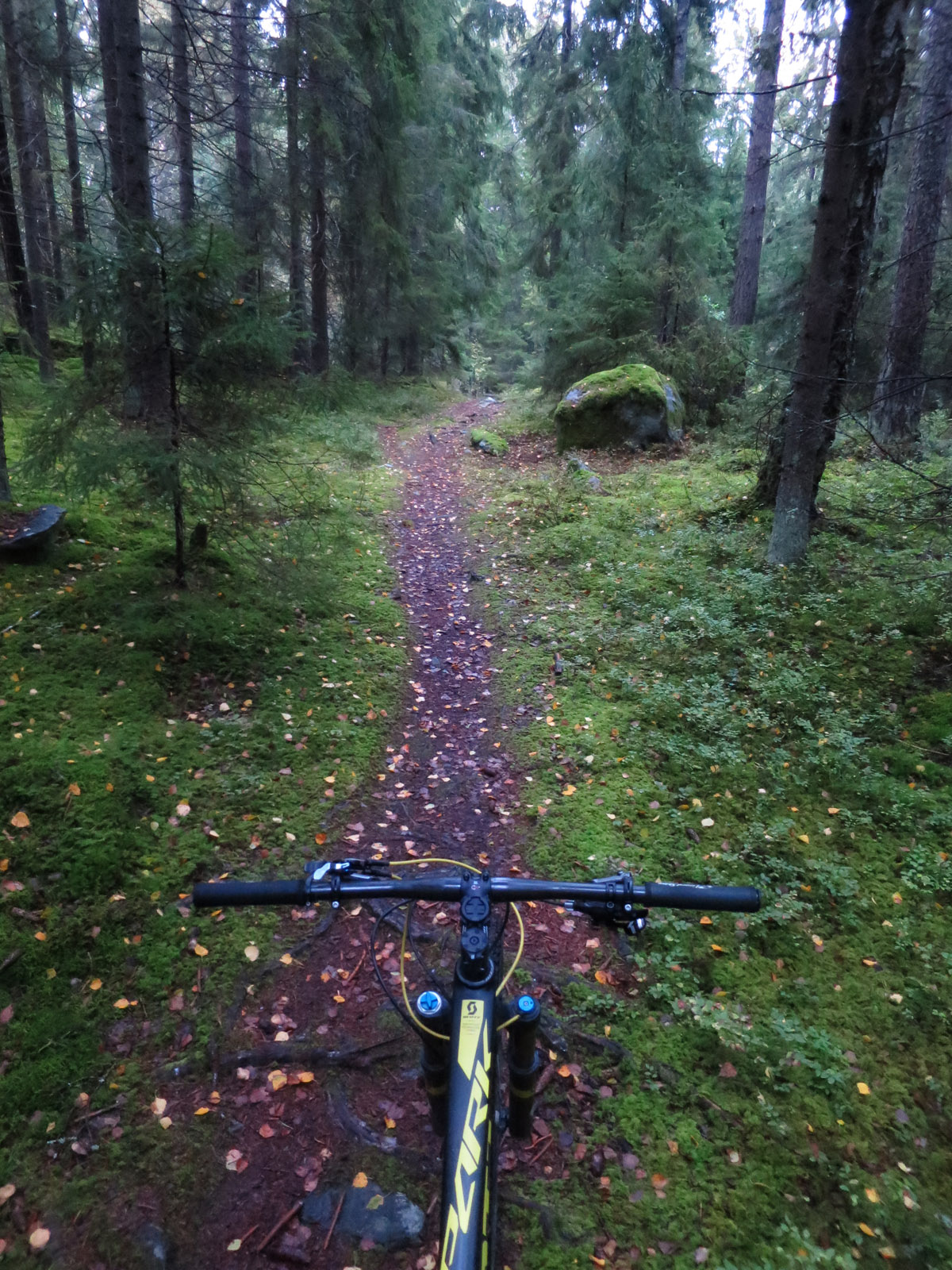 Vi inleder vid Markuskyrkan i Björkhagen, med grusvägsåkning några kilometer, och tar oss förbi golfbanan. En liten brant och en tvär vänstersväng och sedan börjar det roliga – stig som leder mot klassiska träbron över Söderbysjön. Vi får sedan nöta stigar, några branter, dödsrötterna från helvetet, finfin hällåkning, hagar, många spångar, grus, forsar, en och annan teknisk utförslöpa och även lite push bike på sina ställen. När vi närmar oss Tyresta nationalpark, tar vi en väg runt, eftersom det är cykelförbud i nationalparken. Det gör inget, för det finns mycket fin stig vid sidan av med!