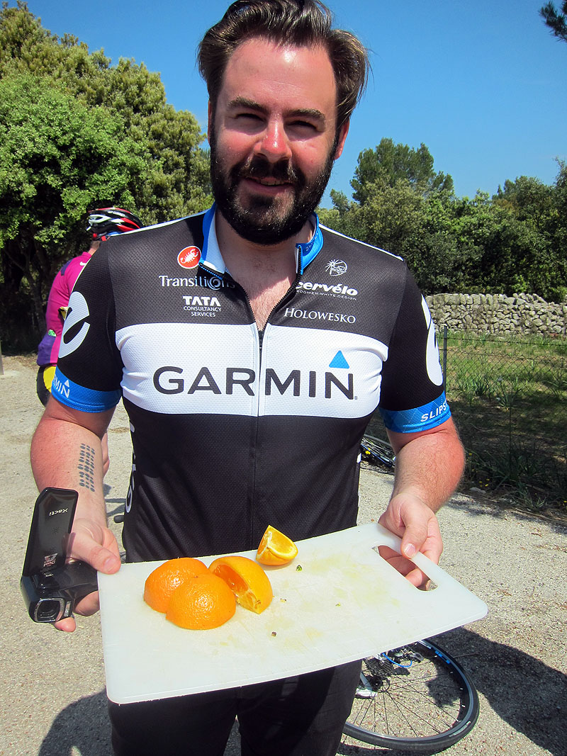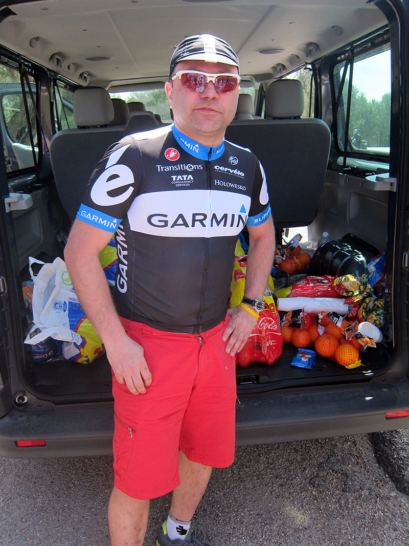 Lunchen i Deia var super, men visade sig vara lite för mycket för mig! Det räckte inte med utförslöpan till Soller efteråt för att jag skulle återhämta mig innan den längsta stigningarna på Mallorca skulle klaras av, från Soller till tunneln vid Piggen (Puig Major alltså, Mallorcas högsta berg). Det tog en stund innan jag fann mig till ro uppför de 14 kilometrarna till tunneln, men efter några kilometer gick det bra. Och bra verkade det gå för alla andra också, i varierande takt. Mathias från CK Hymer var såklart först upp 😉 Väl på toppen mötte superba servicebilen oss med apelsiner, choklad, godis, juice och massa mer. Världsklass!