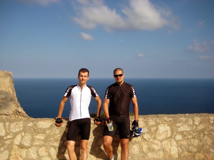 - Paus i Sa Calobra med Medelhavet i bakgrunden (Martin t v, Daniel t h)