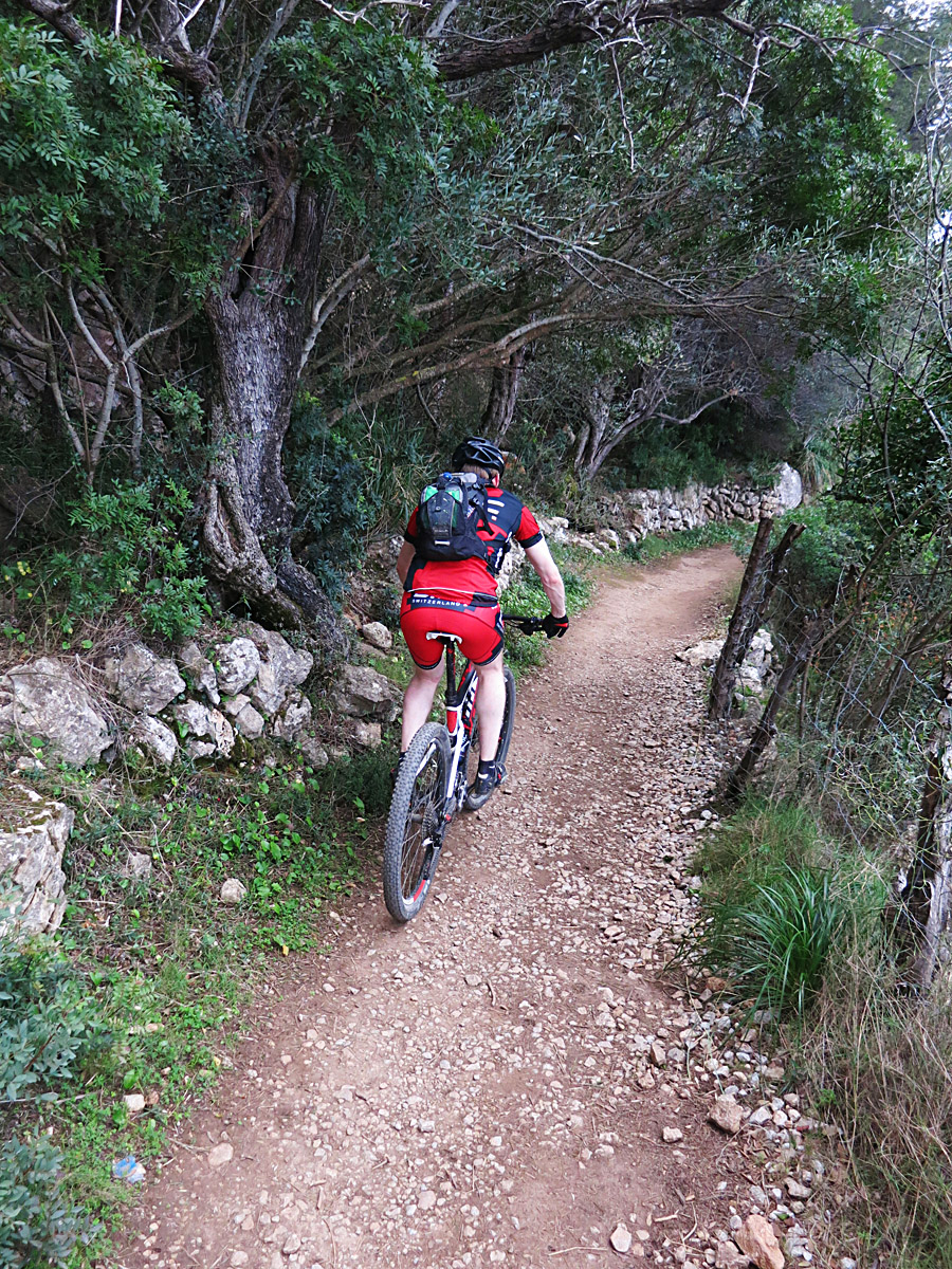 Dagens bästa MTB-åkning började efter att vi kom tillbaka från Balitx-dalen. På en vandringsled mot Soller. Den är svart/röd-markerad, vilket vi snabbt förstod varför. Rätt höga stenar och annat skoj att forcera. Några grindar senare fick vi finfin stigåkning mestadels utför, det vi längtat till hela dagen! Fantastiskt nice och allt detta i gassande vårsol, så klart. Vi skrattade högt hela vägen ner till Soller..