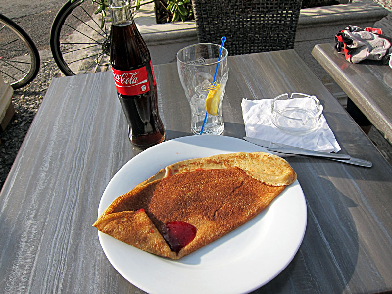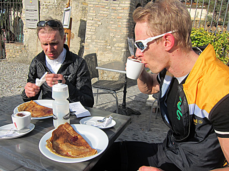 Dagen avslutades med ca 20 % klättring 150 m, precis utanför Cagnes sur Mer – det var tänkt att vi skulle få bra pizza men restaurangen hade inte öppnat på riktigt än, så det blev en fin crepes och cola för egen del innan vi åkte hem och fixade middag: tortellini med champinjoner, lök, skinka och pesto. Ett fint rött vin på det och dagen var fullbordad!