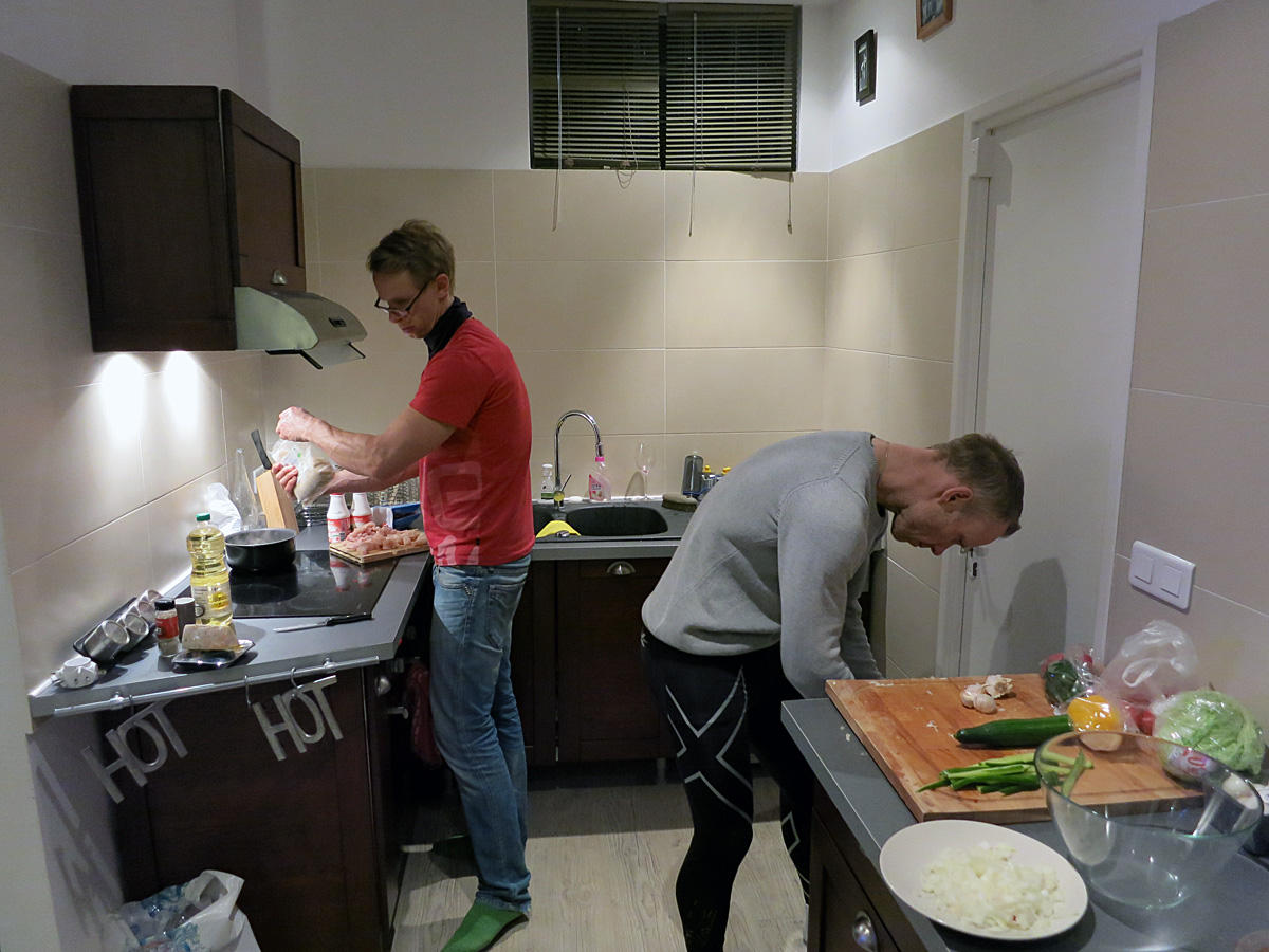Pamp och Tomaz fixar dagens middag, kyckling med ris och ostsås.