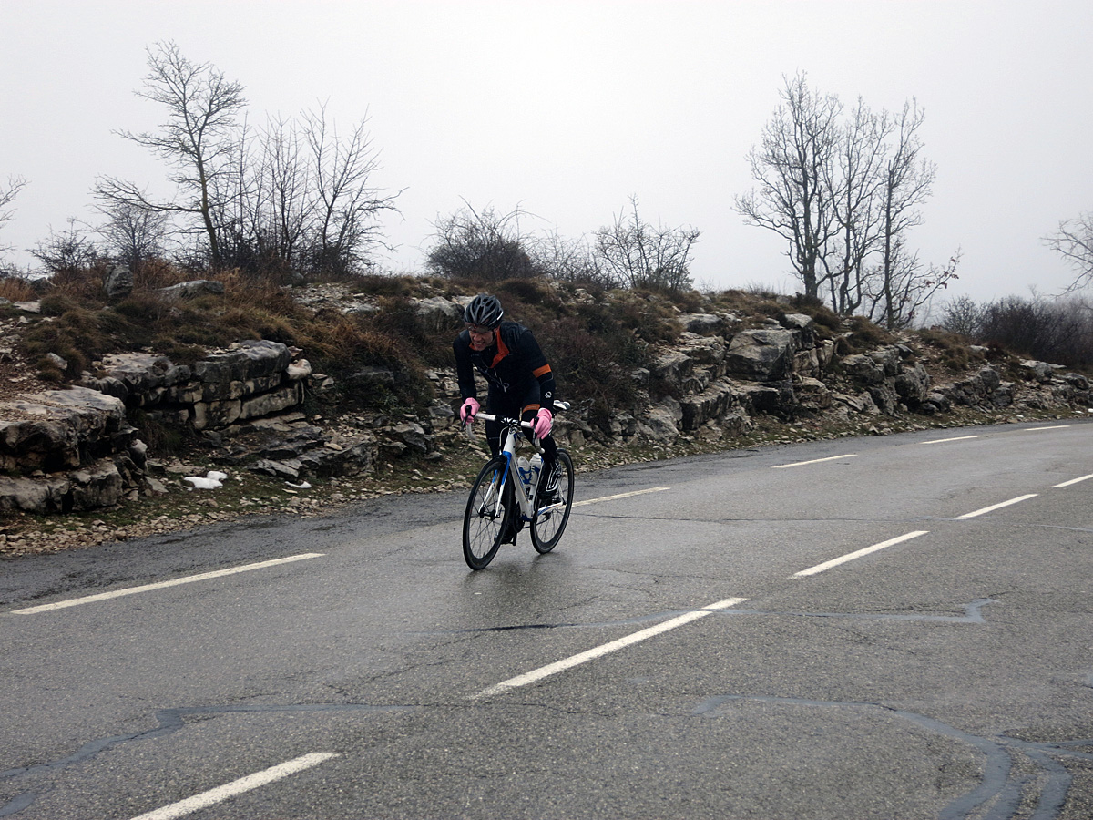 Siktet för dagen var inställt på Col de Vence och Gourdon. Upp till Vence var det knäpptyst i gruppen, ingen sa något alls. Regnet strilade ner och letade sig in överallt. Sedan började det roliga: Tröskelträning uppför till Col de Vence – 9.7 km, 6,5 % och 630 höjdmetrar.