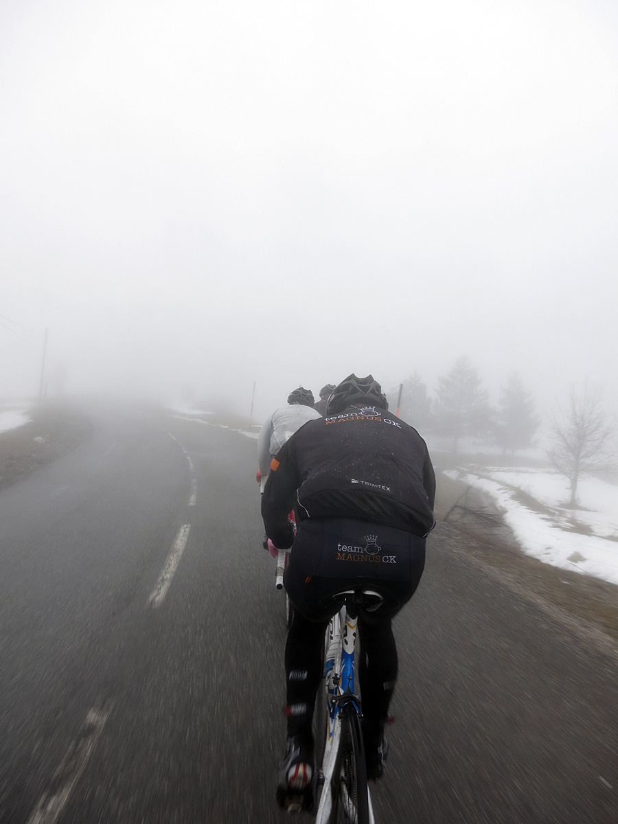 Sista dagen här nere. Mastodontpass inplanerat och inte minst Paris-Nice etapp och alltså kolla på proffsen. Siktet inställt på Col du Ferrier och bergspriset för proffsen där. Dit var det närmre 9 mil och i princip bara uppför i 4 h innan vi var på plats i dimman. Okej, det var lite nerförslöpor här och var, men citerar Tomaz: ”vettefan om det var det alltså”.