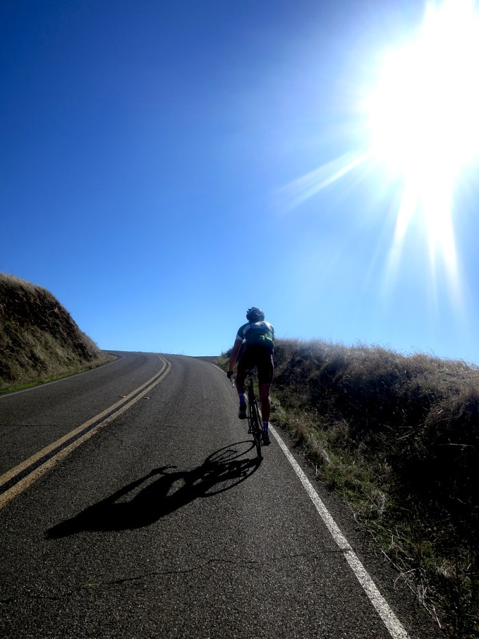 Kusten närmade sig med stormsteg och den annalkande utförskörningen tog honom till Stinson Beach, där det var dags att rulla tillbaka och uppför längsmed Stilla Havets rand. Landskapet böljade, humöret likaså. Berget gjorde stundtals kaos med hans ben, det var inte lätt. Solen var på väg nedåt och det var dags att lägga på ett kol nu. De sista kilometrarna gick av bara farten och sedan var han tillbaka där dagens första klättring hade börjat.