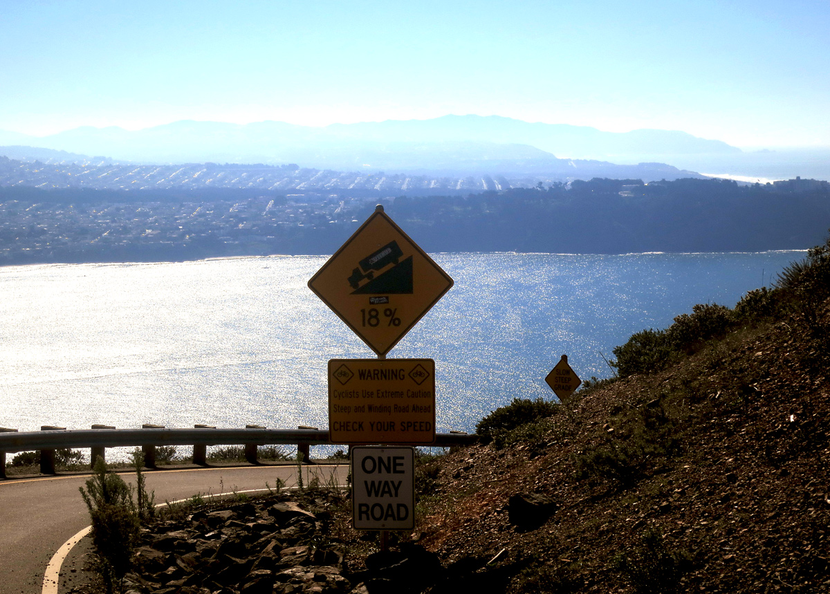 Efter vattenpåfyllning var det dags för 15 km nerför. Vi klarade oss fint, men vi såg en kille som kört omkull i en snäv kurva och satt vid vägkanten helt klart medtagen. Han var tack och lov OK så vi rullade vidare neråt till Sausalito och den sista biten hem.