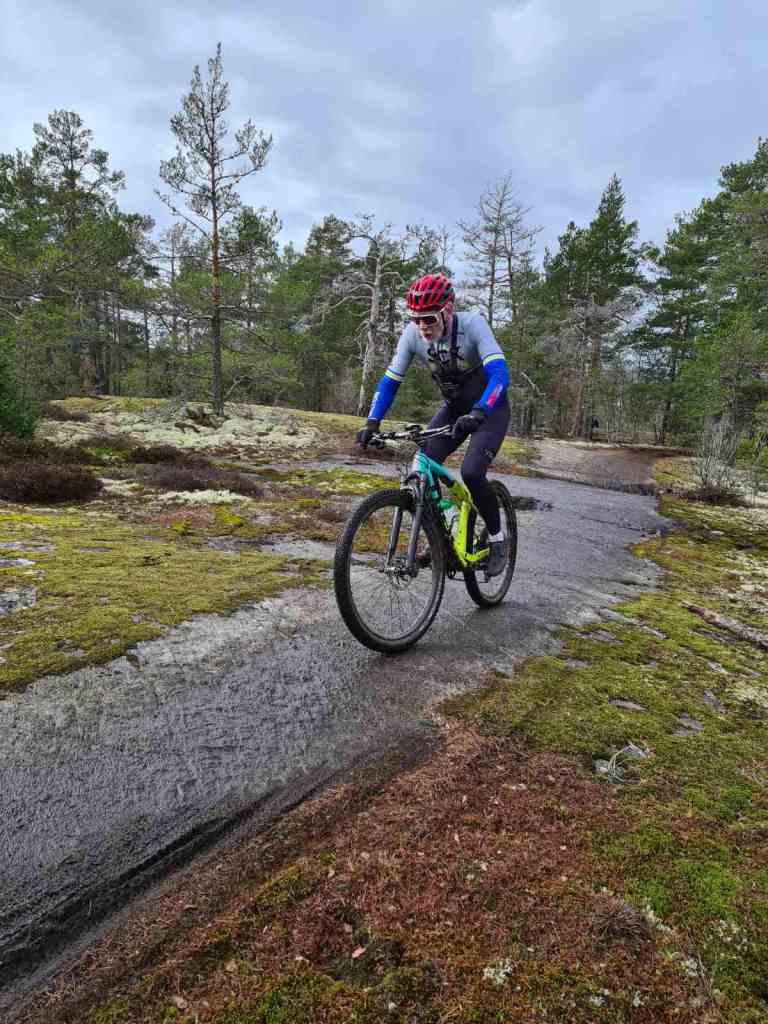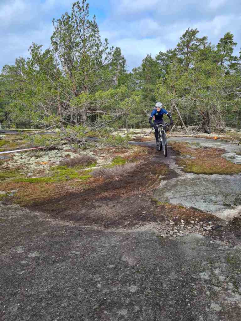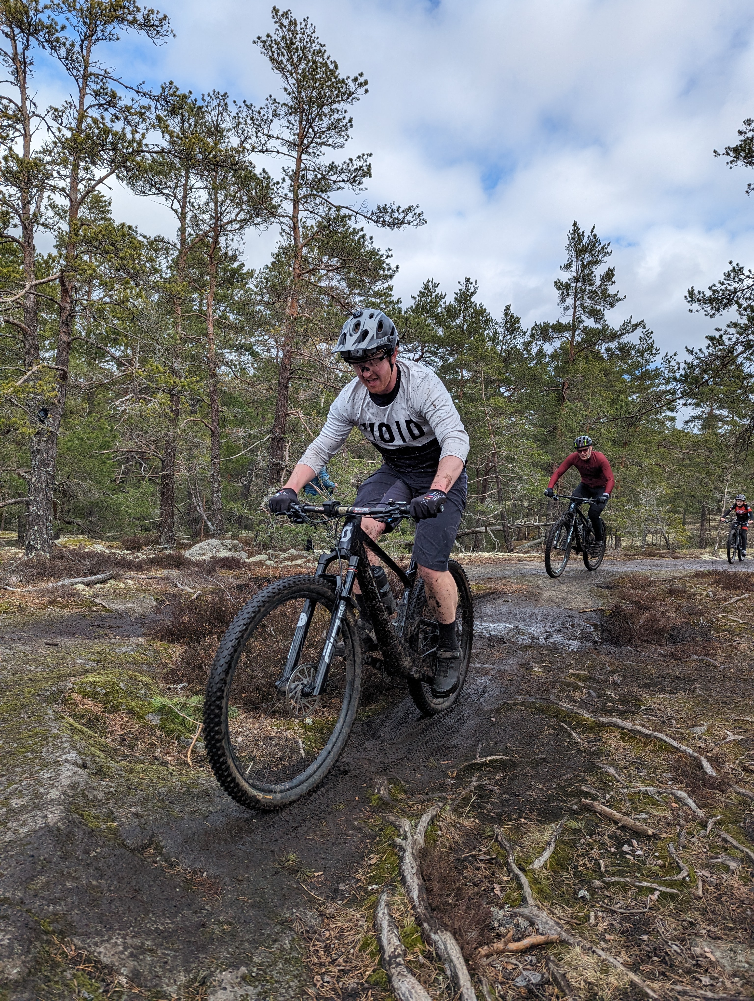 Så småningom går vi in på det nya partiet för i år – med två tekniska branter att klara av. Den första zickzackar jag uppför och fixar det och drar ifrån. Den andra kommer jag helt fel på och hoppar av och springer, när cykelkompis Niklas plötsligt dyker upp påhejandes i skogen. Tack för det!