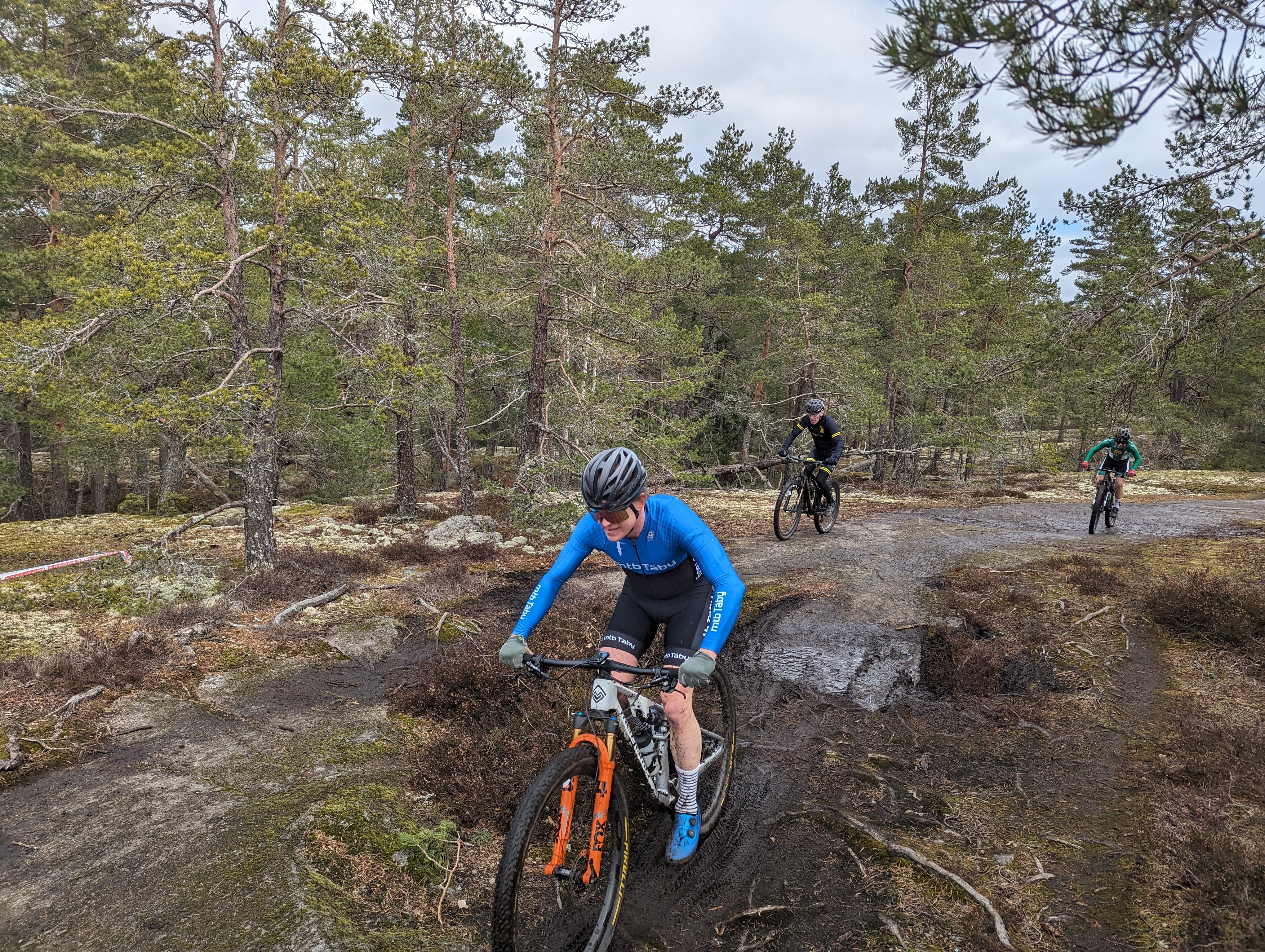 Framför allt 1082 är en riktig tuff rackare som trycker till och skapar lucka hela tiden, främst på stigarna. Jag får bita i och hålla jämn, hög fart i stället för att accelerera snabbt, och kommer alltid ikapp. I ett motlut, kanske det kallat ”Lillbacken”, tappar han plötsligt allt och jag och 1088 går ifrån lätt. Snart har jag återhämtat mig tillräckligt och det är dags att ta täten i vår tvåmannagrupp. Då och då skymtar vi MTB Täby-åkarna och snart även en större grupp.