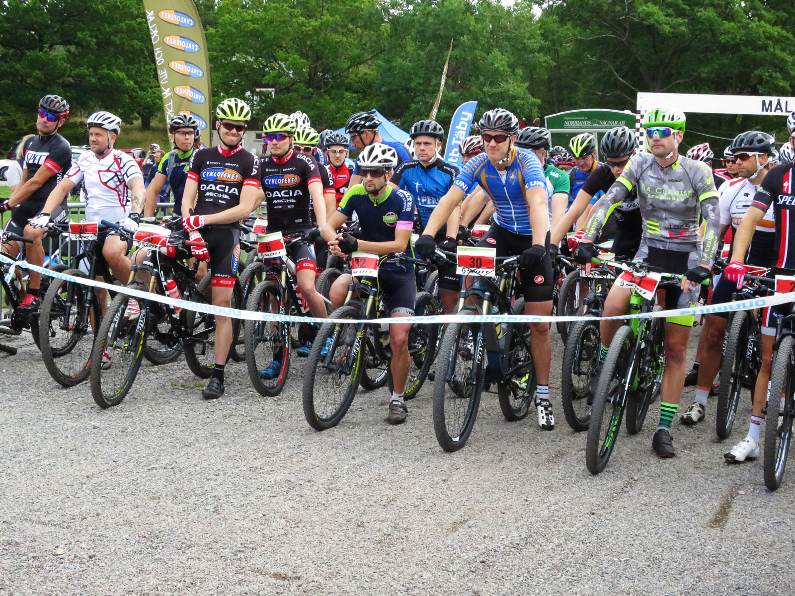 45 sek innan start kommer jag på att jag har för mycket luft i däcken. 1,45 bar, jag vill ha mindre. Så jag pyser snabbt ut luft ur båda däcken och känner att det får bli som det blir med däcktrycket. Det jag förlorar på stigarna har jag igen på grusvägarna, och så vidare.