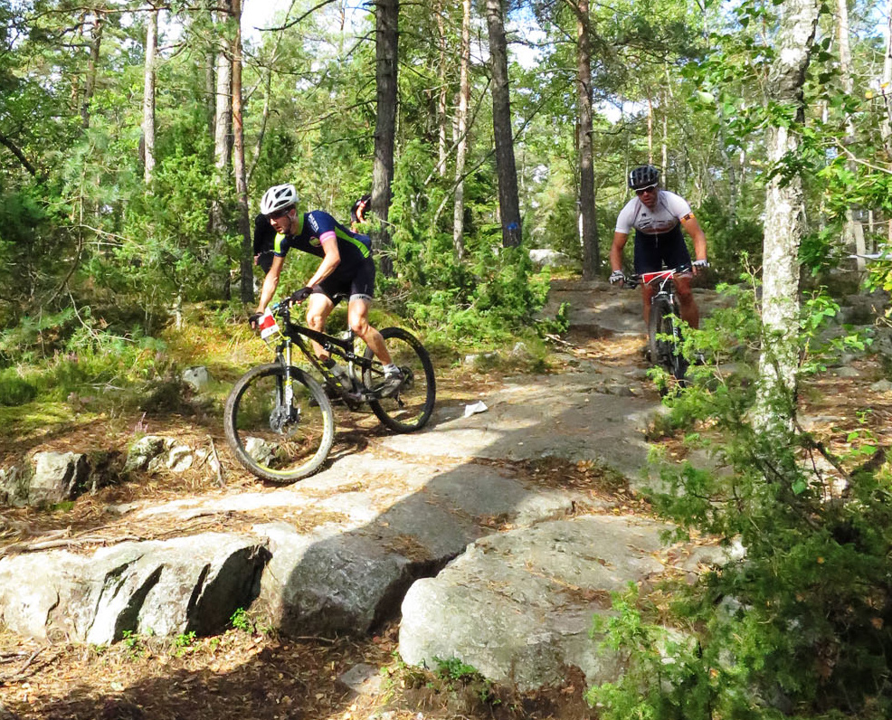 Jag klämmer i mig en halv koffeingel. Sedan kommer den stökiga stigen som går över hällar och några blöthål. Per är klart starkast och får lucka på oss med 30 m. Jag gillar den här stökiga åkningen och våra heldämpade hojar är tacksamma att köra på. Jag har inget vidare flyt, men strax efter detta parti är vi återigen ikapp Per och kan ta oss bort mot nästa lilla utmaning, Nackamasterna. Jag går upp och håller lagom fart för att få med mig både Per och Rasmus. Sedan kör vi nästa roliga stigparti över hällar och genom myrar. Rasmus sackar efter och snart är det bara Per och jag.