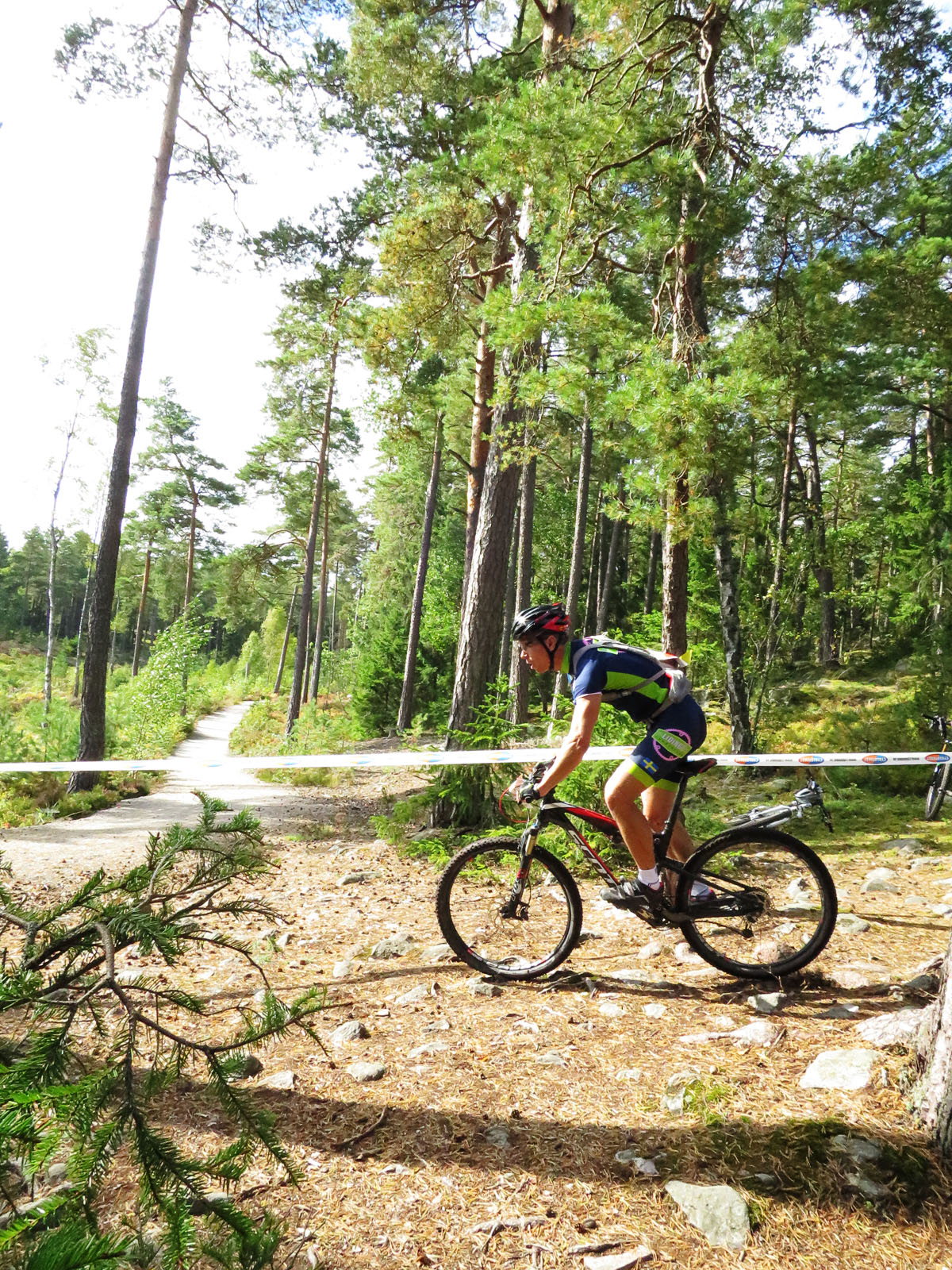 Efter halva första loopen har jag stabiliserat mig något och nu får jag sällskap av två killar, Christian och Ola. Vi får till ett samarbete, turas om att ta förningar och jag ser till att vara först in på i princip varje stigparti på banan. Vi kommer inte ikapp någon, men ingen åker ikapp oss heller.