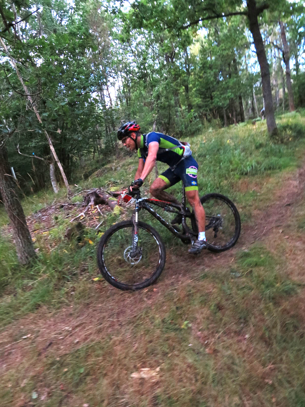Per Kumlin & co kommer bakifrån och jag ansluter. Vi kör bra, tills jag går i backen efter en snabb utförslöpa – det blir riktigt slirig lera och jag känner hur hjulet glider undan och jag landar mjukt i gräset. Allt lugnt. Upp igen och börja jaga. En stund senare kommer en fin och snabb utförslöpa. Här tappar jag kedjan?! Den virar in sig flera varv runt sig själv och jag får spendera 1 minut med att fixa den. Christian kommer farandes nerför backen och nästa gång ser jag honom i mål.