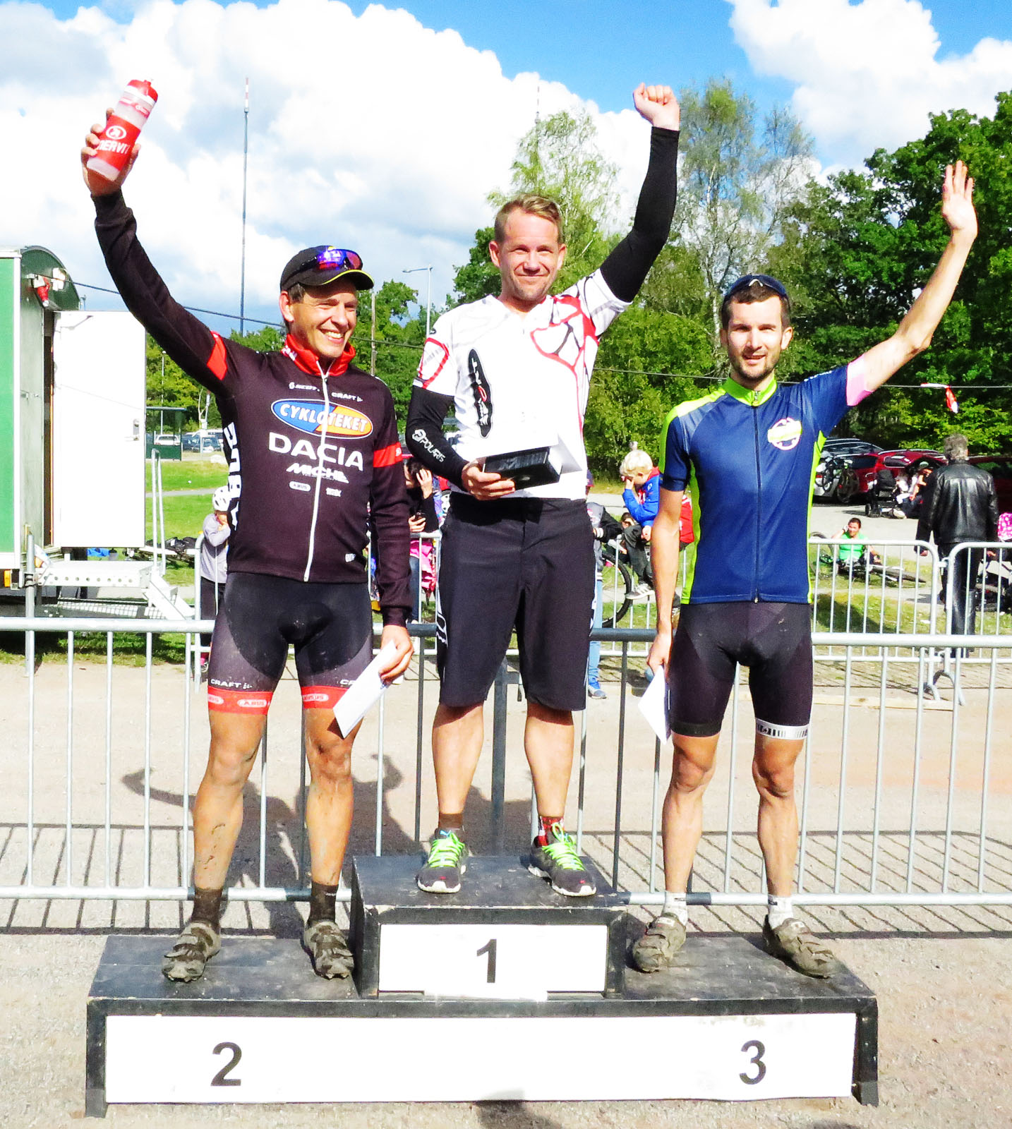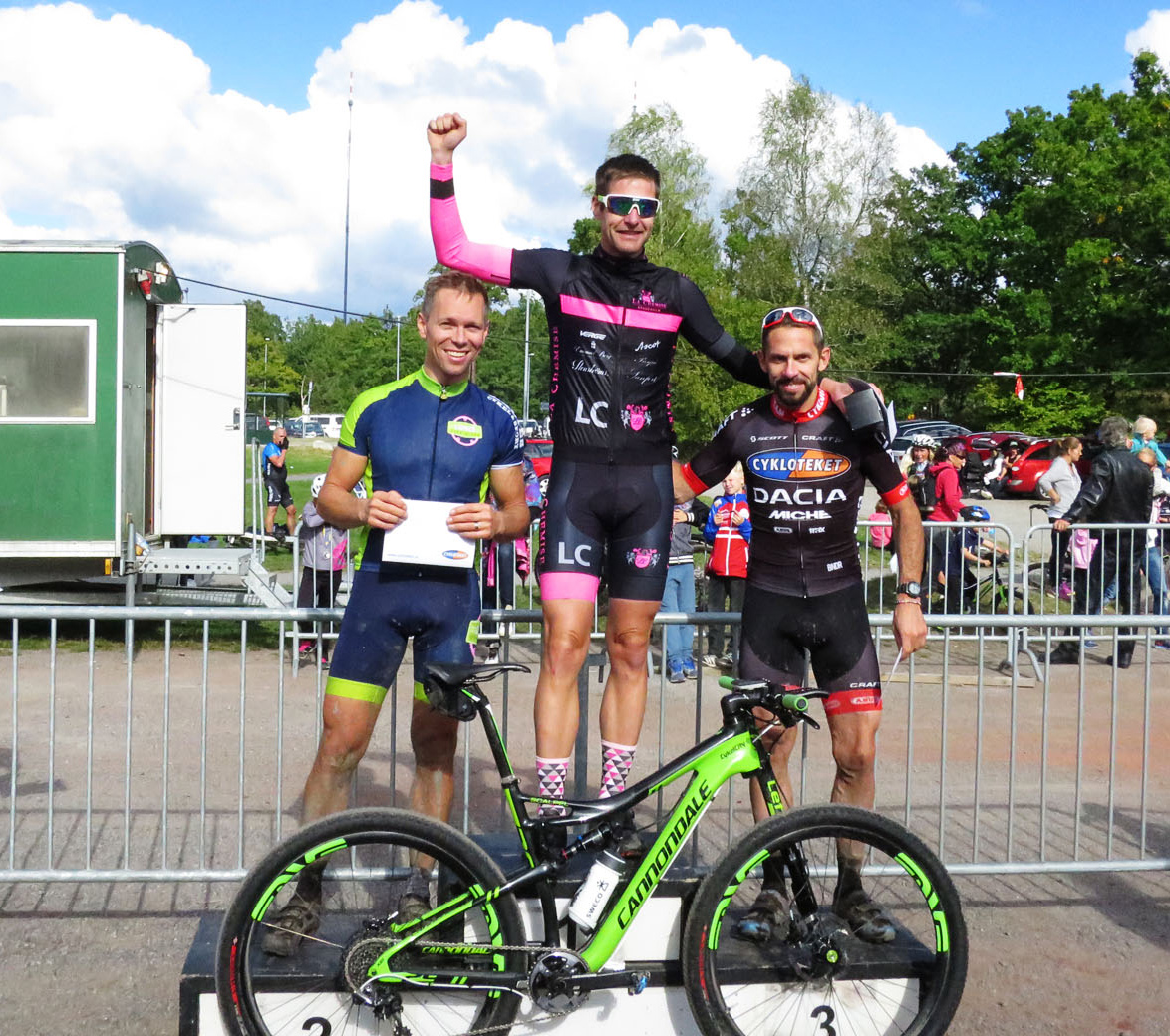 Mot slutet har jag sällskap med tre elitkillar, som gasar iväg sista 3 km. Jag håller min placering och rullar besviket i mål. Där sitter Christian och har fixat dricka mm. Döm till min förvåning dessutom att jag rullade in på en 16:e plats i H30! Där blev jag lite nöjdare i alla fall.