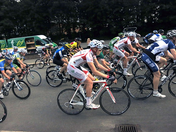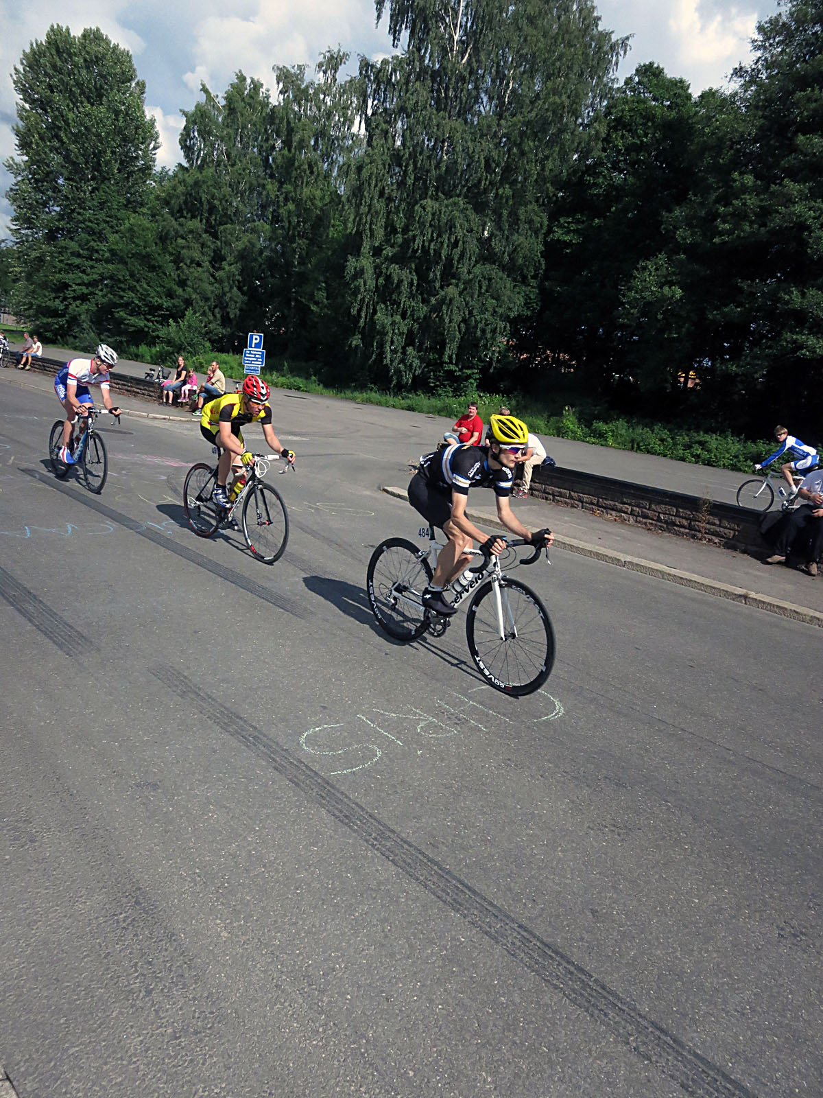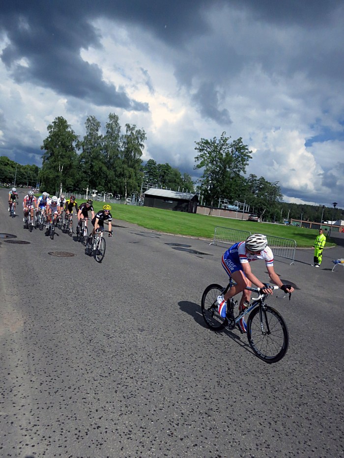 Jag tänkte såklart vara med högt upp redan från början och hade en topp 30-placering första varven. Dock finns det ju mer rutinerade tävlingscyklister än jag som på något sätt tar sig fram sjukt enkelt i klungan och efter ytterligare några varv låg jag i nedre tredjedelen i huvudklungan istället. Inga riktiga problem, men för många varv långt bak och det börjar ge resultat så att säga – på 10:e varvet förmodligen så tappade jag koncentrationen i två kurvor och hade sedan inget hjul att gå på = tappade huvudklungan. Det var såklart fler som tappade och kom att tappa och till slut var vi 10 st i en grupp, där nästan alla redan gett upp tävlingen, vilket gjorde att vi bara var 3 st som turades om att gå runt.