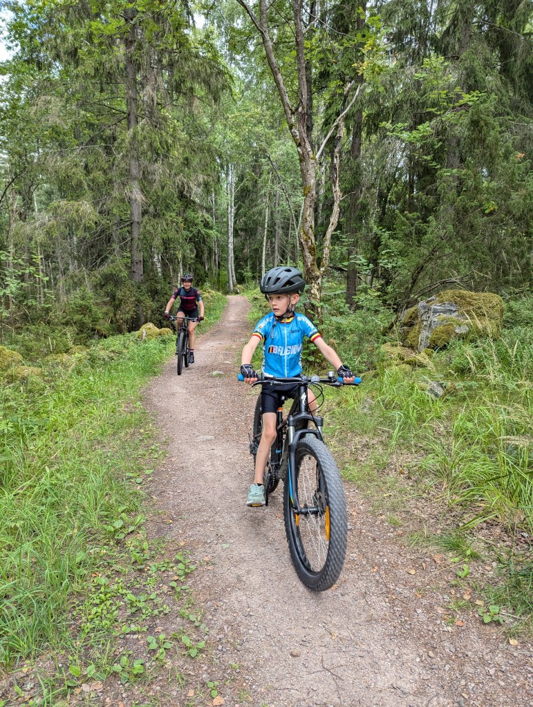 Blåa spåren i Högbo har varit helt suveräna – en blandning flow trail med lite snällare rötter och stenar, några mindre backar och lite grusväg. Alldeles lagom för många inklusive för vår 6-åring.