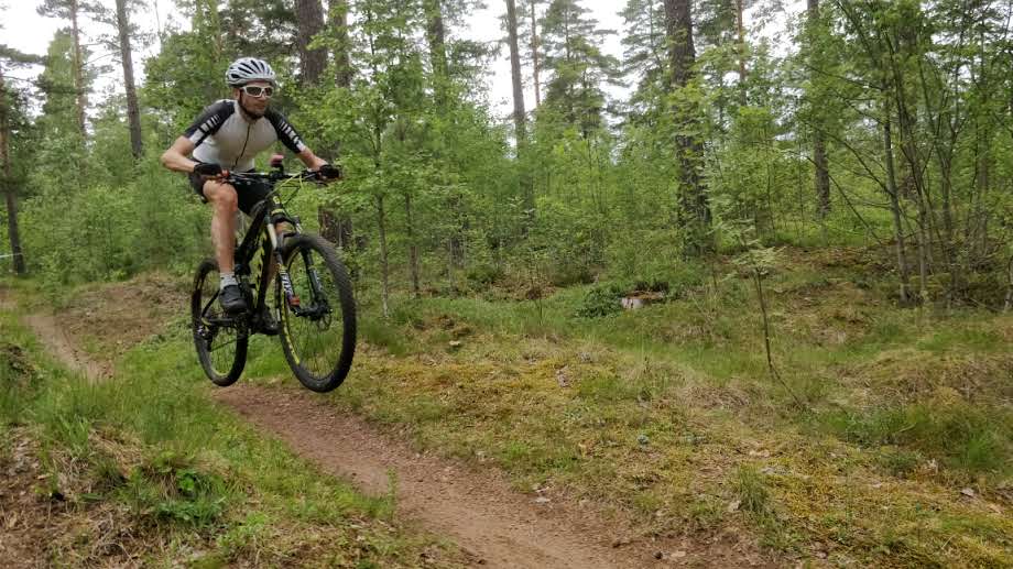 Jag tar startbacken först och leder in på första stigen. Tyvärr cyklar jag fel 2 gånger i inledningen och halkar ner till femte plats rätt snabbt, med hyggliga luckor framåt. Snart ikapp polare Christian och vi hjälps sedan åt att hålla koll på banans pilning, som är rätt knepig att följa. Felkörningar är lika vanligt som kottar i granskogen idag, det jämnar nog ut sig för alla.